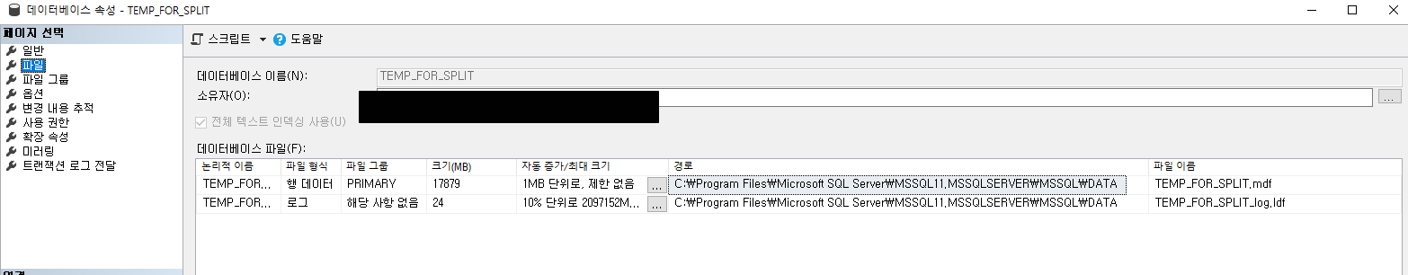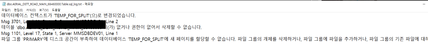 파일 그룹 'PRIMARY'에 디스크 공간이 부족하여 데이터베이스 'TEMP_FOR_SPLIT'에 새 페이지를 할당할 수 없습니다. 파일 그룹의 개체를 삭제하거나, 파일 그룹에 파일을 추가하거나, 파일 그룹의 기존 파일에 대해 자동 증가를 설정하여 필요한 공간을 만드십시오.