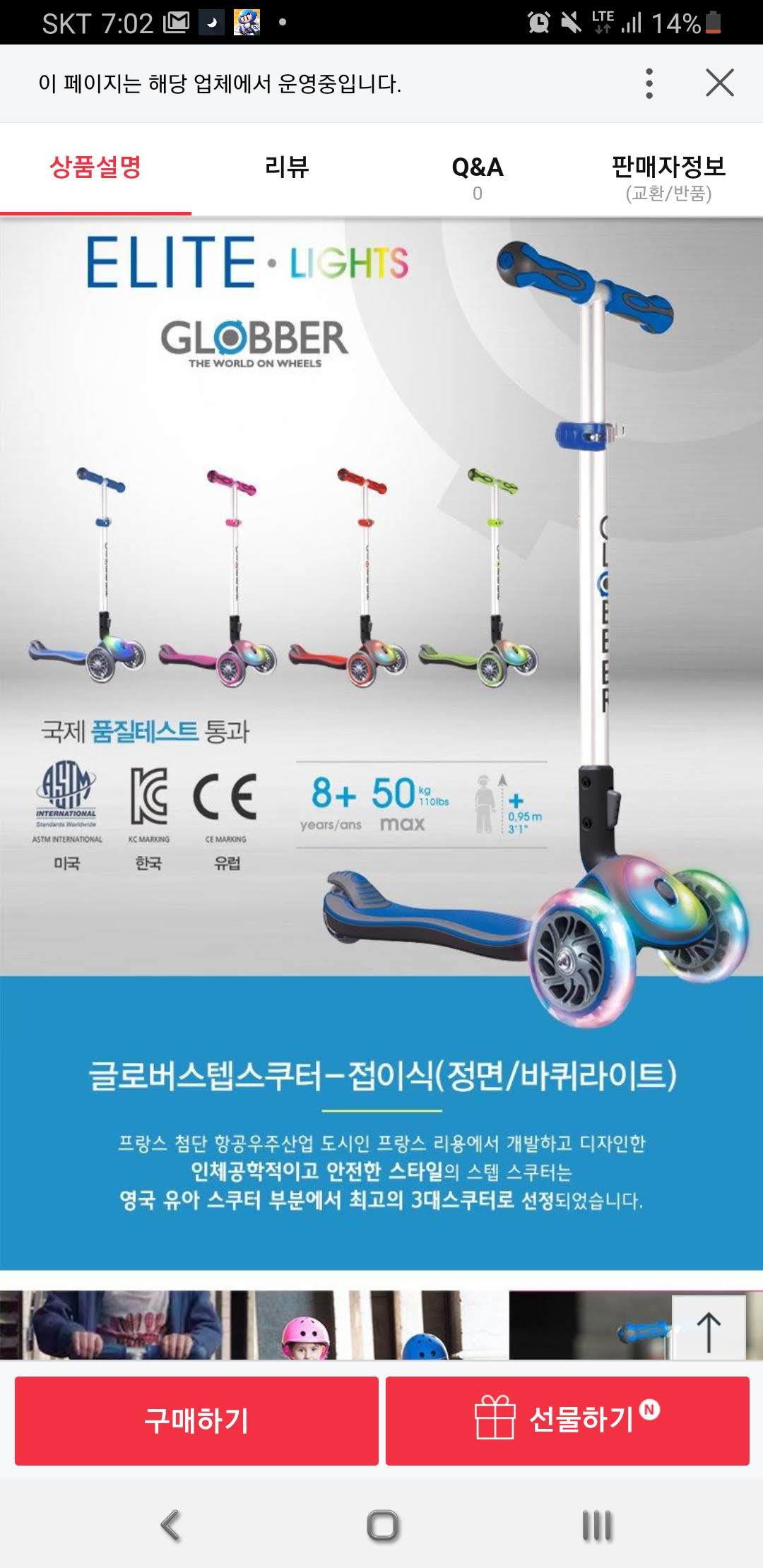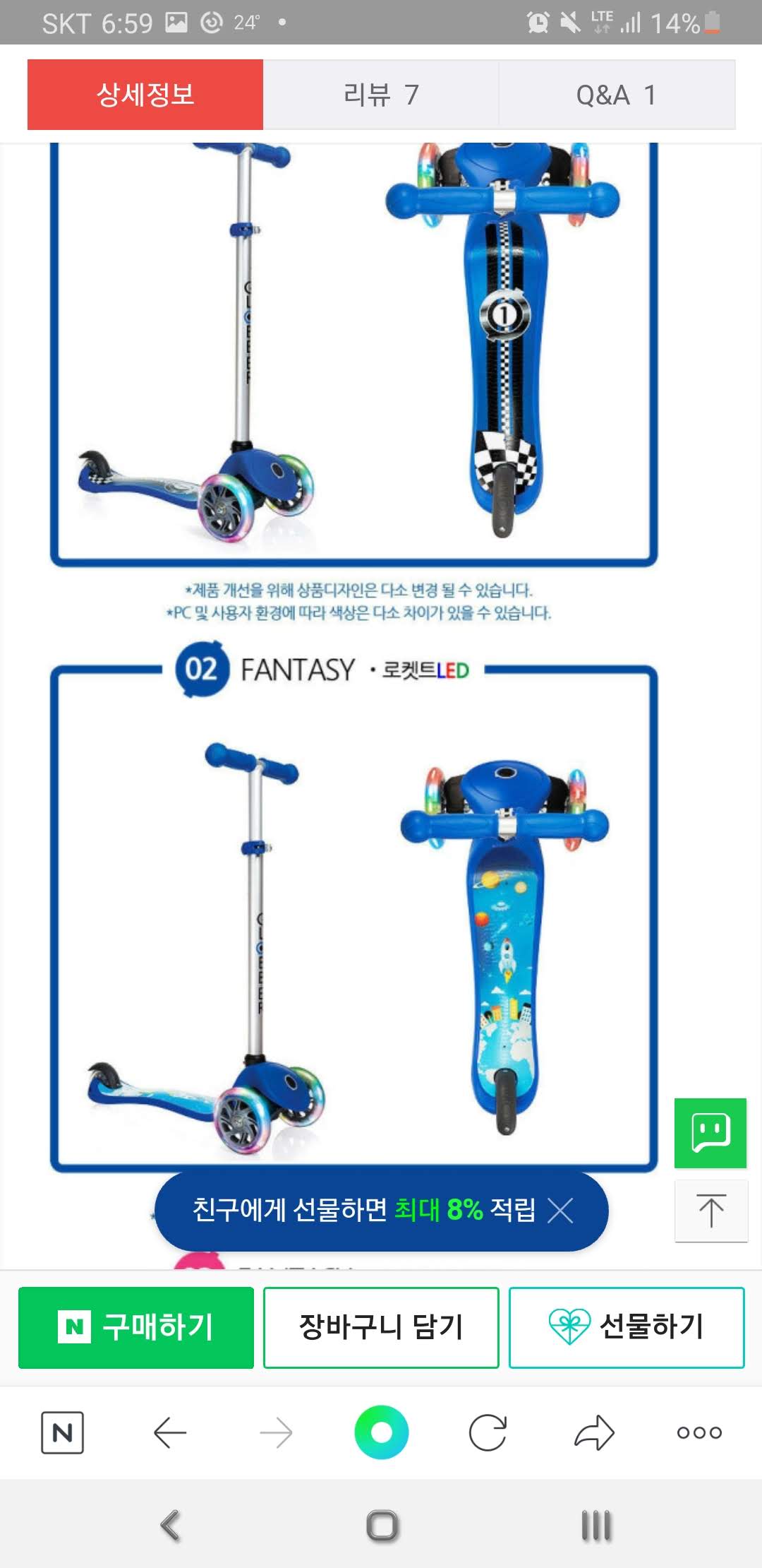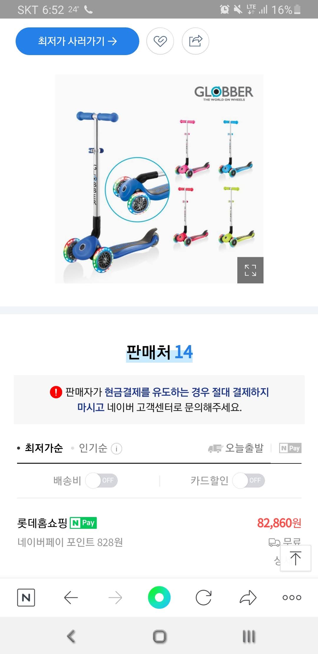 제경우에 파란색에 아이가 좋아하는 패턴이 그려진 LED바퀴의 킥보드를 58000에 구매했습니다.