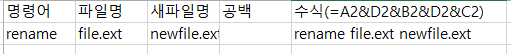2. excel 에서 파일명 변경 스크립트 생성 : 엑셀의 각에서 =A1&B1 이런식으로 값을 넣으면 합쳐진 결과가 생성됩니다.