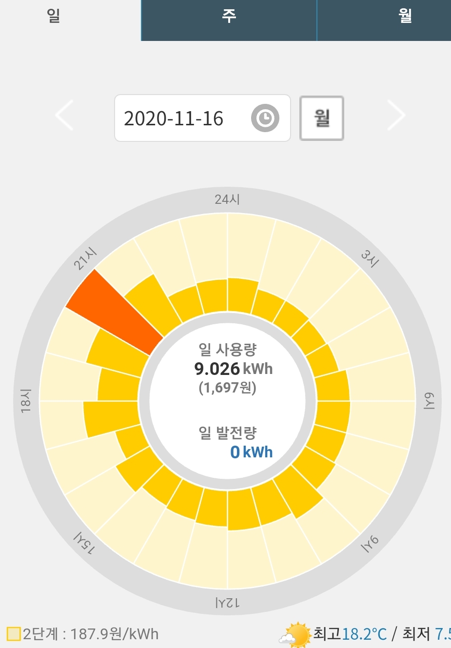 사용량 메뉴에서 일자별로 어떤시간에 전기 소비가 많았는지 확인이 가능합니다.