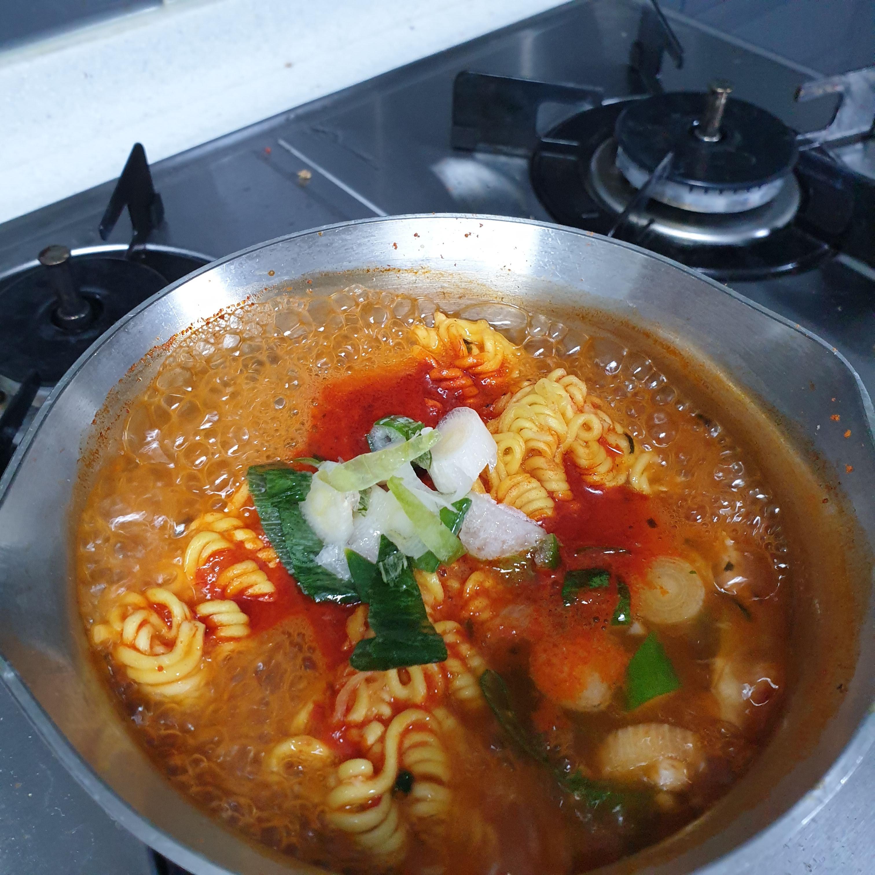완성된 라면의 빛깔은 매운 색깔입니다. 일단 면발을 먹어봤을때