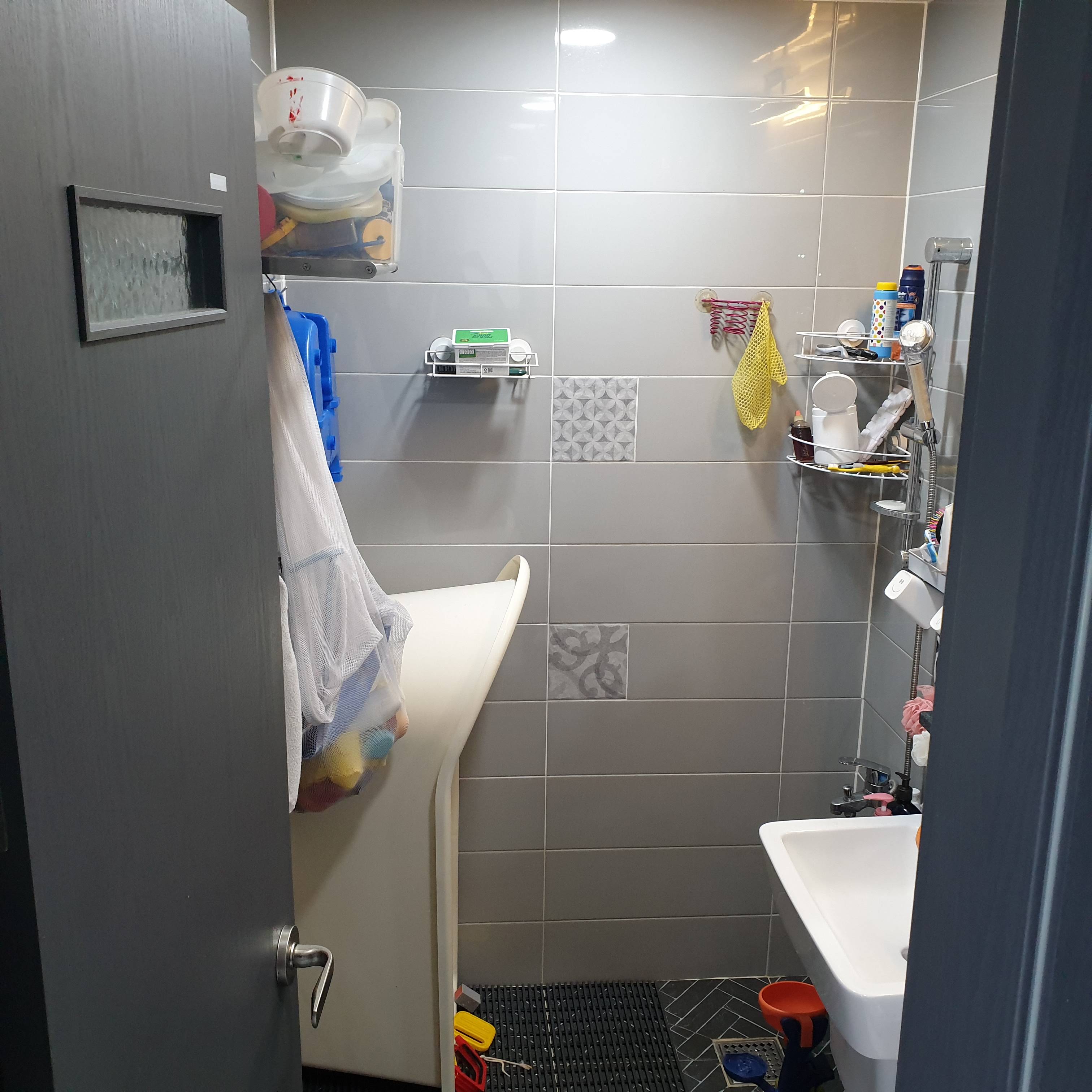 화장실 : 화장실은 속건 타일이 깔려있고, 저희는 미끄럼방지 매트를 어울리는 색으로 깔아두고 사용하고 있습니다. 이동식 대형 욕조를 사용해 아이와 목욕을 자주 합니다. 천장이 높아 선반을 활용해 수납을 늘렸습니다.