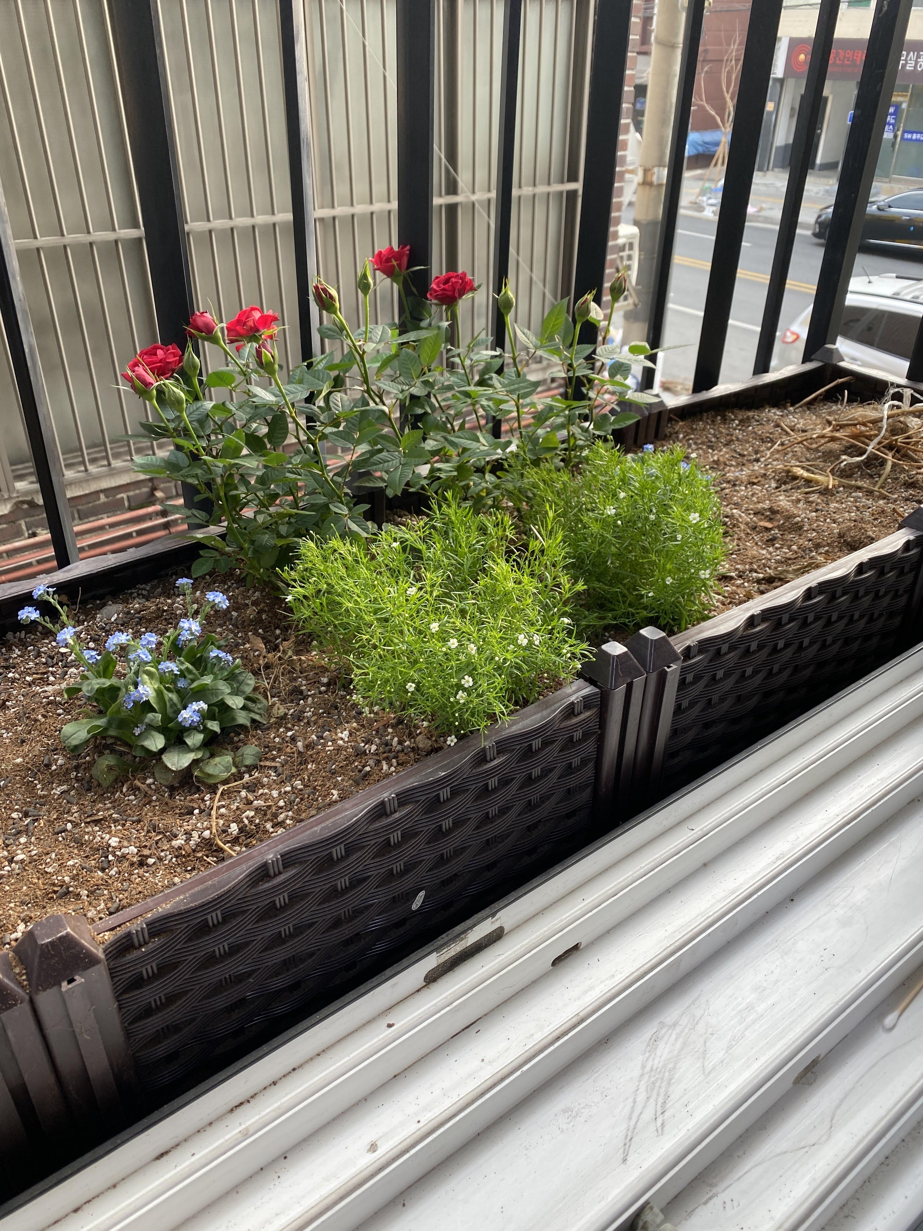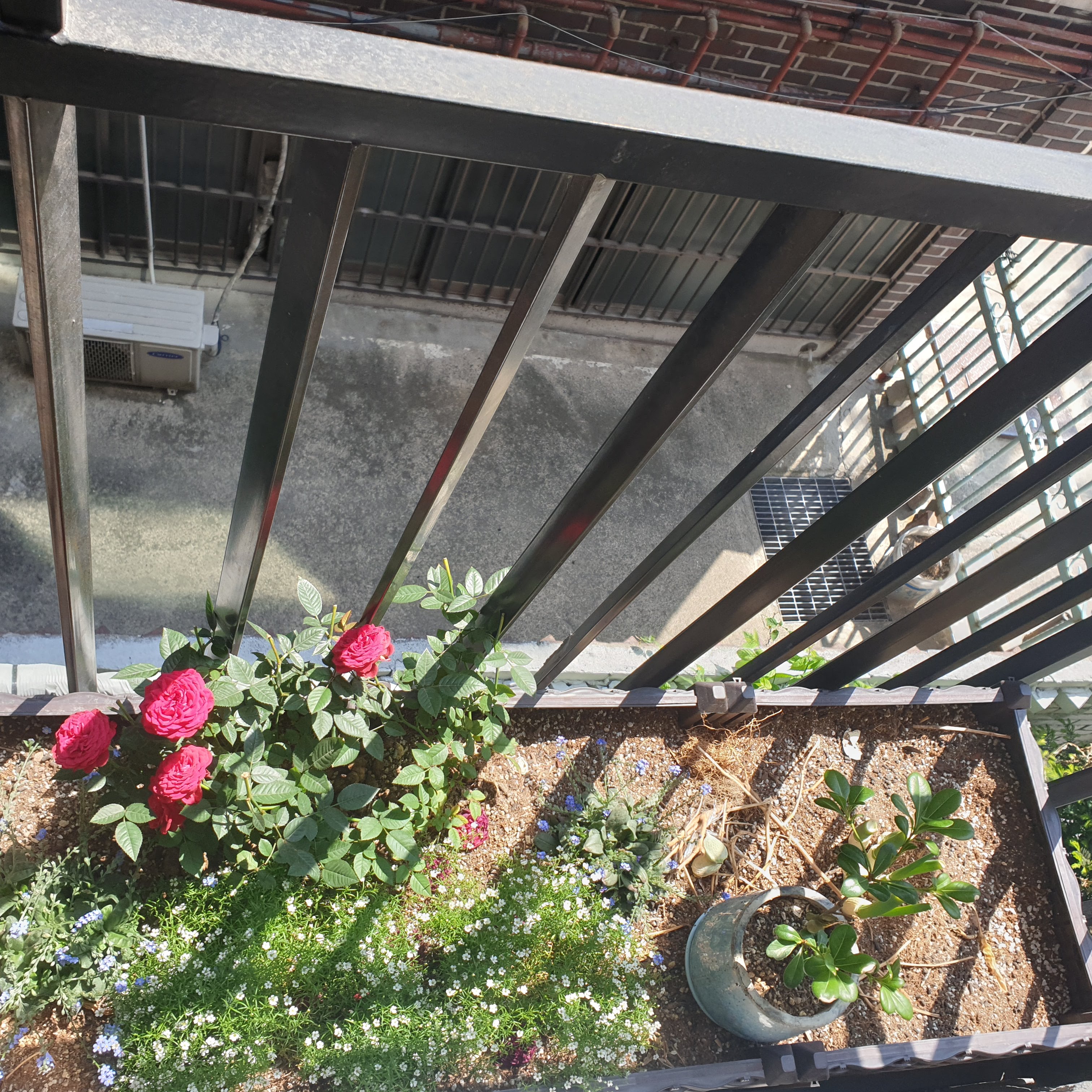 거실 난간 : 넓은 거실 난간이 있습니다. 에어컨 실외기를 밖으로 빼고 텃밭을 꾸렸습니다.아침마다 아이가 꽃에게 안녕하고 인사합니다.(그리고 파테크..)