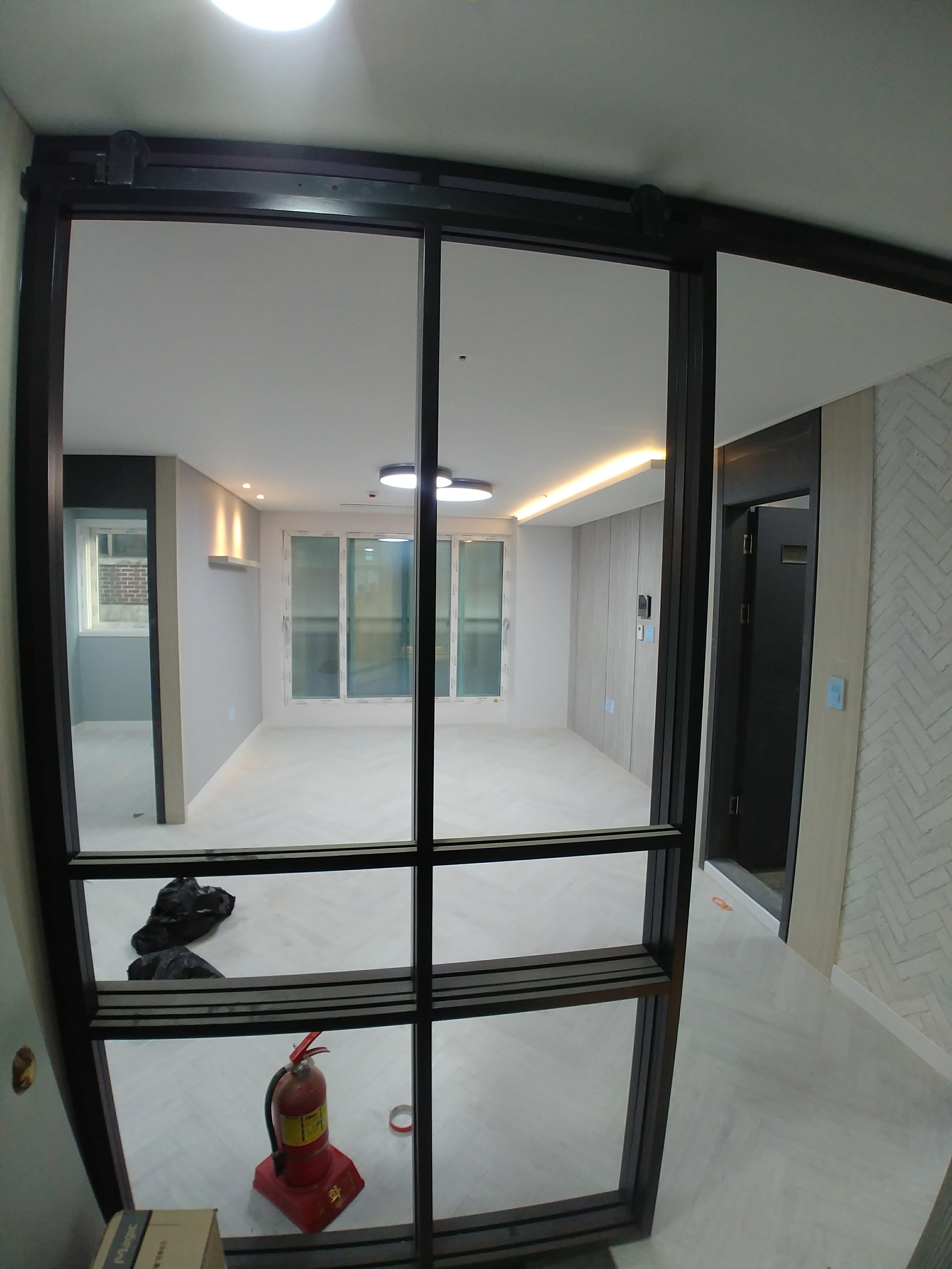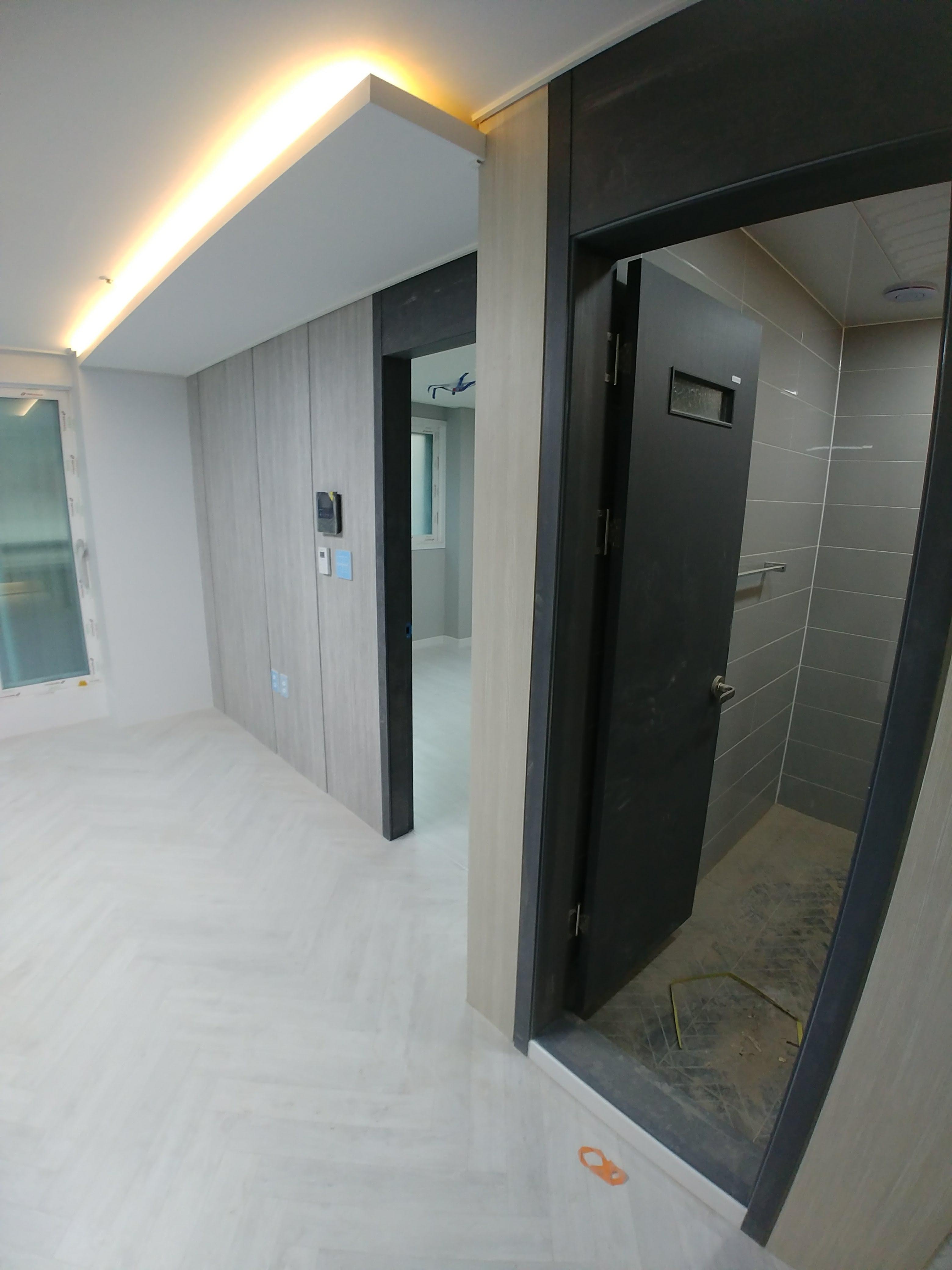 문 : 방과 방사이에 턱이 없어 아이들이 뛰어다녀도 걸리지 않고, 방문이 높습니다. 화장실은 문에 작은 유리창이 있습니다. 바닥은 강마루 헤링본으로 시공되어 있습니다.