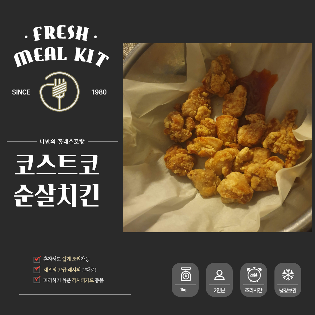 일단 비쥬얼은 그럭저럭 만족스럽게 나옵니다. 근데 치킨양념을 싹 뿌려서 먹어 봤을때, 소금에 먹어 봤을때.. 뭔가 순살치킨의 순살 맛보다는 약간 냉동 탕수육고기 처리를 할때 쓰는 그런 특유의 맛이 느껴져서.. 좀 거부감이 들었습니다.