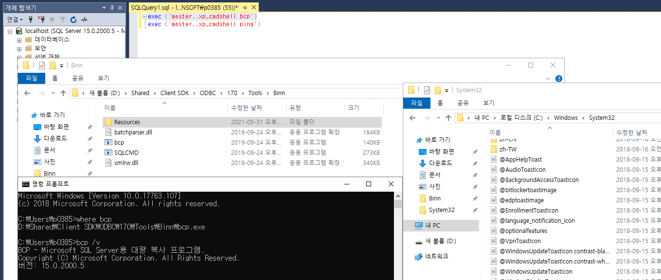 조치. Windows\System32 경로에 bcp 툴을 위치시켜 주니, 잘 동작했다.