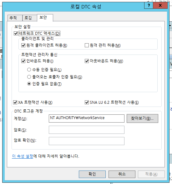 1. 분산 트랜잭션 설정 : 구성요소 서비스 - 보안구성