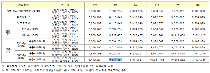 신혼 특공의 경우 4인가족을 보고있는데 140% 가 9931887 입니다. ㅠㅠ 기준이 공고마다 바뀌는것 같습니다.
