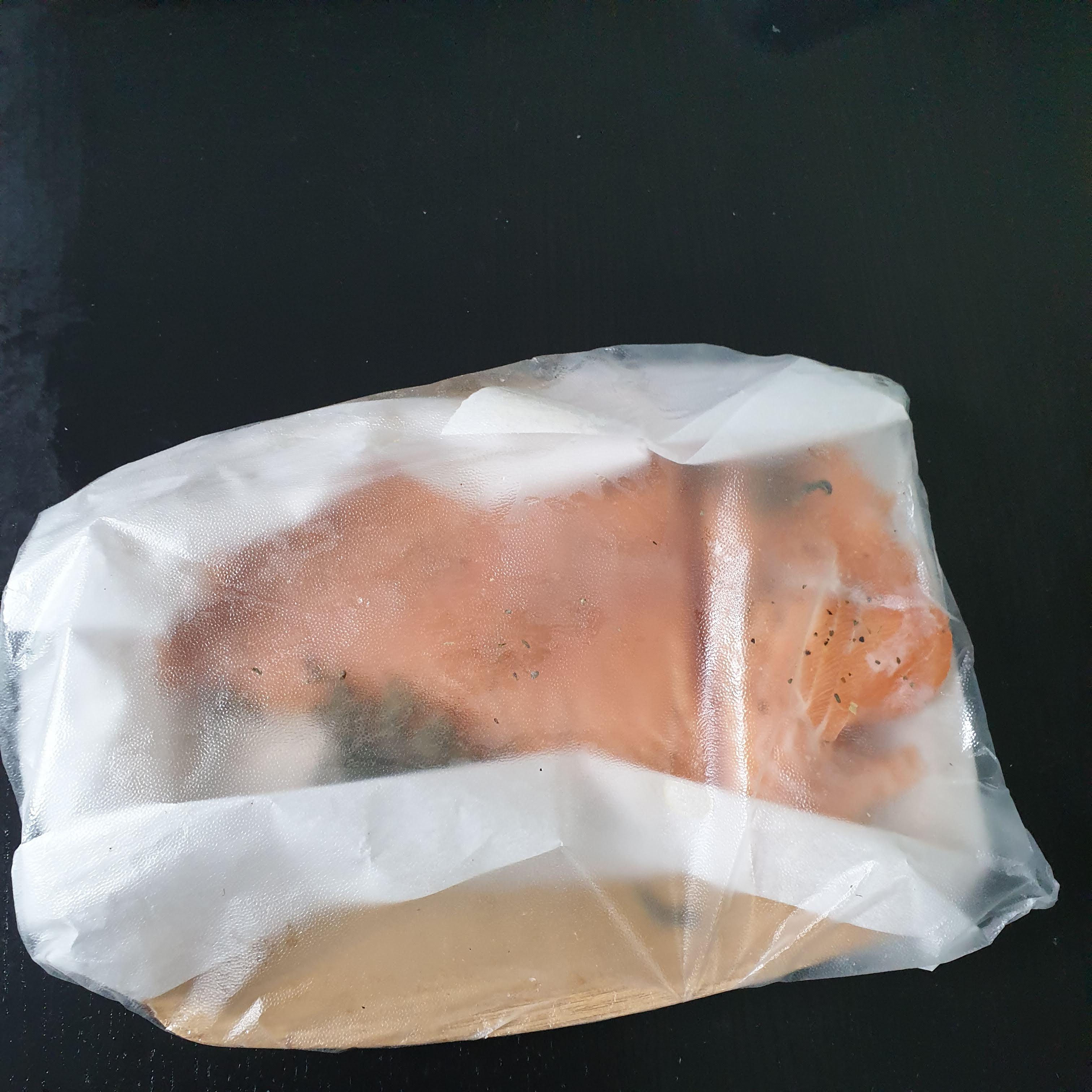 소분하기! 연어를 길게 펴고, 올리브유 바르고 1끼 사이즈로 잘라서, 진공 포장/밀봉, 먹을 껀 냉장, 저장 할 껀 냉동