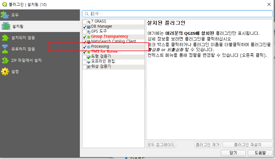 Qgis 전문가에게 물어보니, 기본 플러그인 중 Processing 이란 부분에 체크가 안되어 있을 때 그런 현상이 발생한다고 했다.