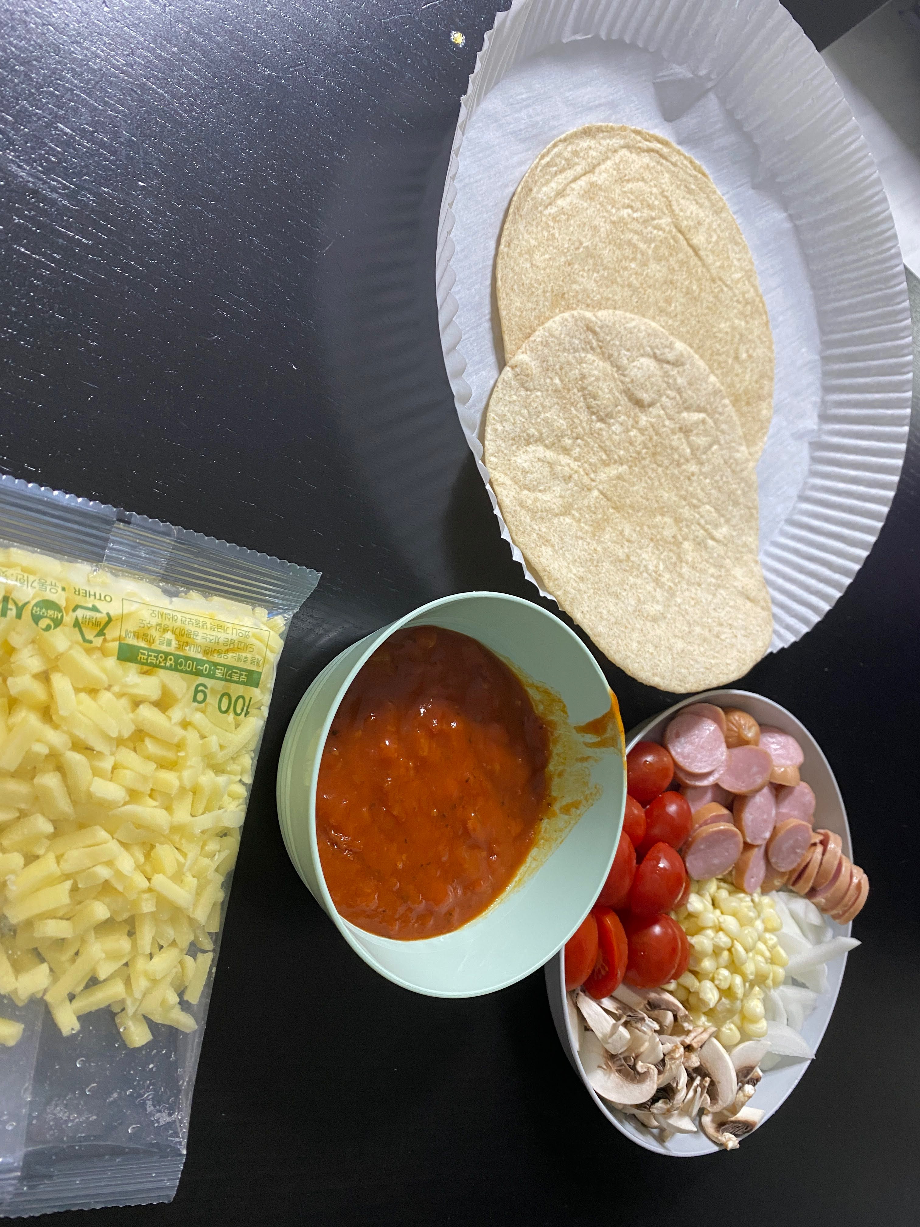또띠아를 사서 토마토스파게티 소스를 펴바르고