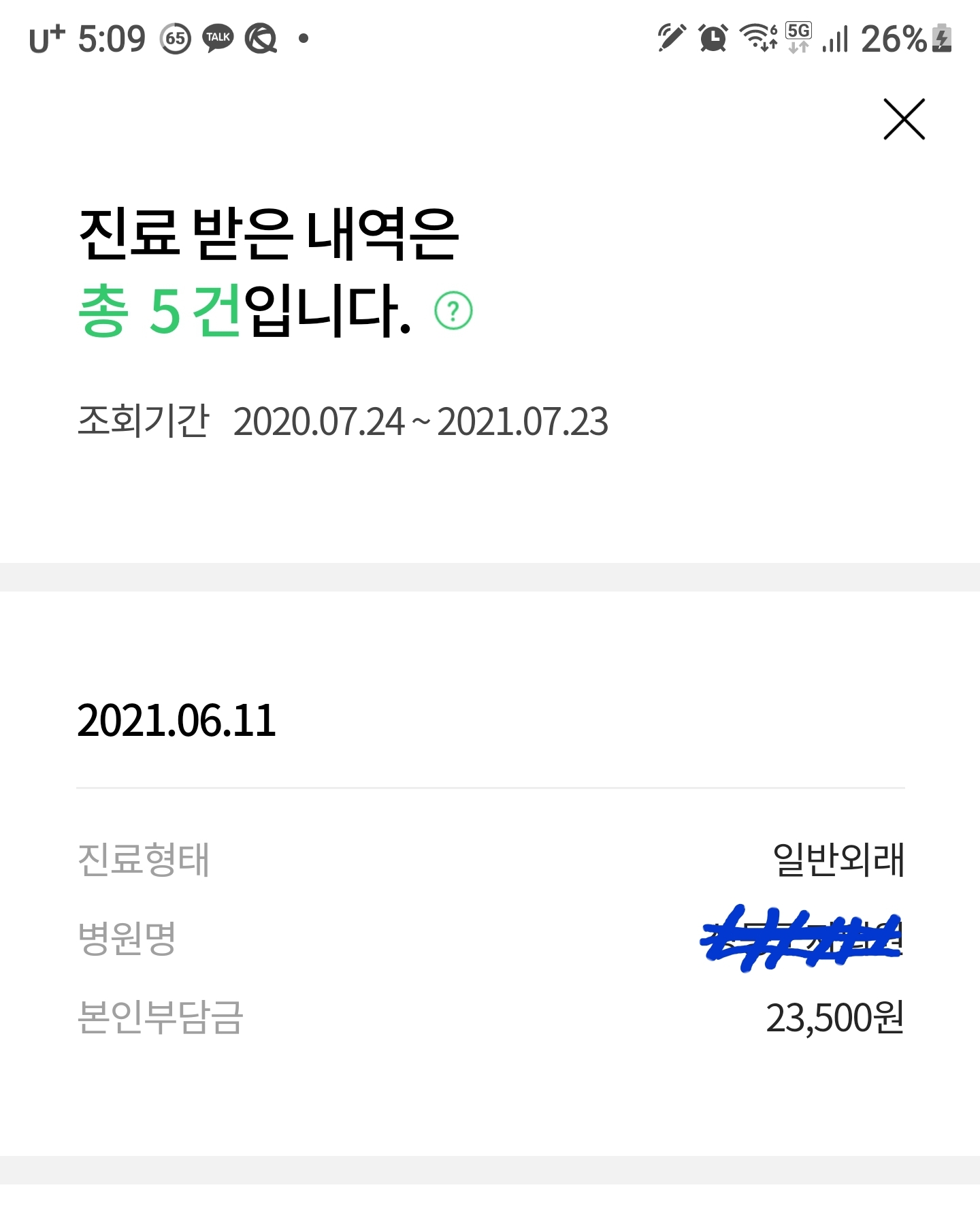 6월 11일 이면 얀센백진 접종 다음날이고 코로나 검사만했는데 진료기록에 이렇게 본인부담금 명목으로 비용이 기록되어있다.
