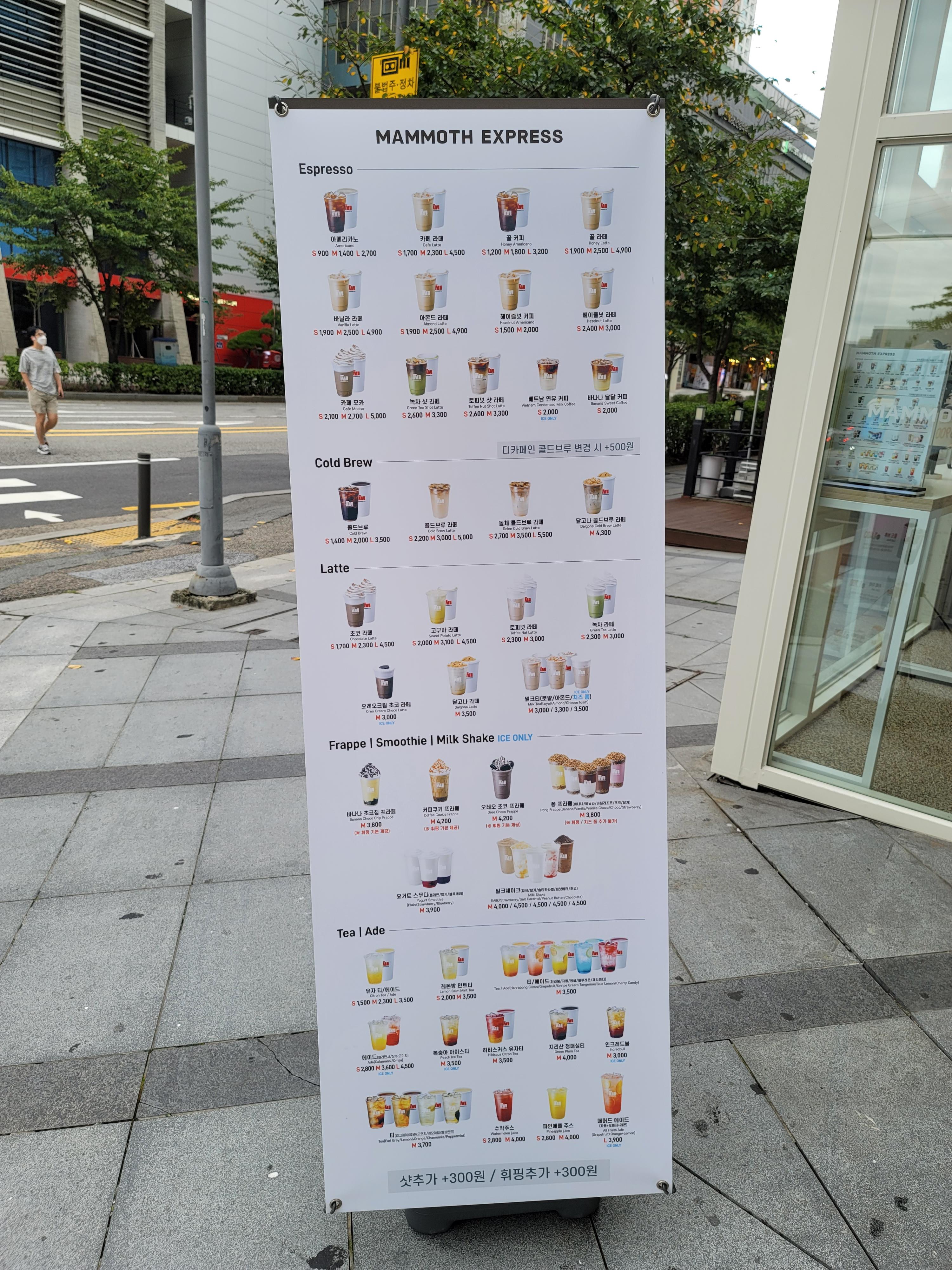 맘모스 커피 예전에 얼핏 봤을때 양만 많고 맛은 별로라는 이미지였는데, 가게도 매우 깨끗하고 무엇보다 메뉴가 어마무시하게 많네요.