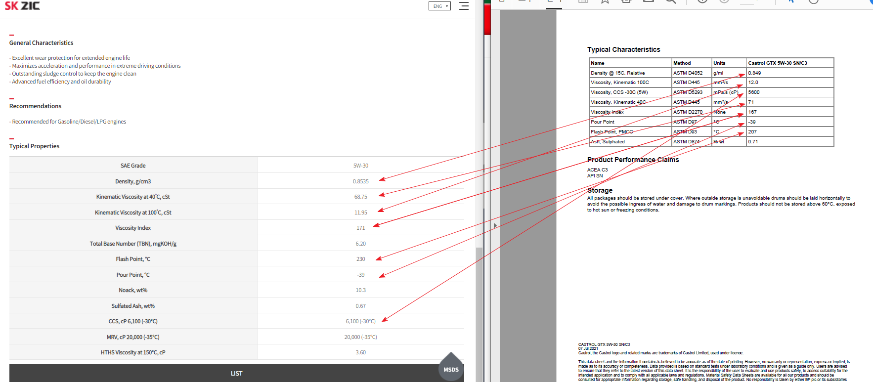 동점도(Kinematic Viscosity) :(-) 온도에 따른 밀도의 변화를 계측한 점도 = 오일이 얼마나 잘 흐를 수 있는 정도를 나타내는 지표 일반적으로 40도와 100도 온도 조건으로 나누어 계측합니다. 40도 그리고 100도의 조건에서 액체가 어느 정도의 응집력 또는 밀도를 지니게 되는지를 측정한 것이죠. 액체는 온도가 올라가면 점도가 낮아지는 특성을 보이므로, 이를 수치화한 것이라 보면 가장 적당할 것 같습니다.
