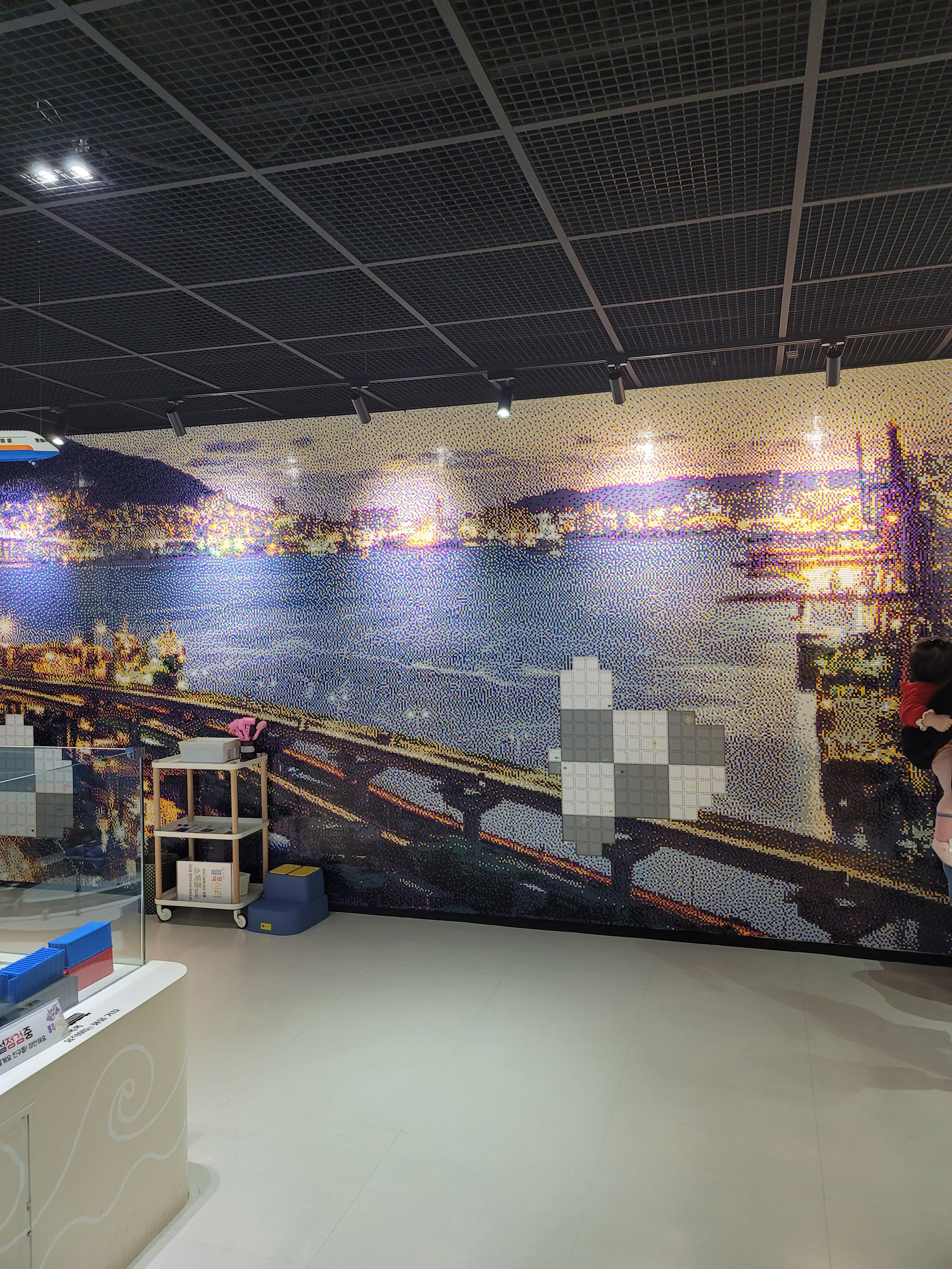 무역항 사진을 조립하는 체험 행사가 있는데 블럭 조립이 익숙하지 않은 아이는 보호자의 도움이 필요합니다.