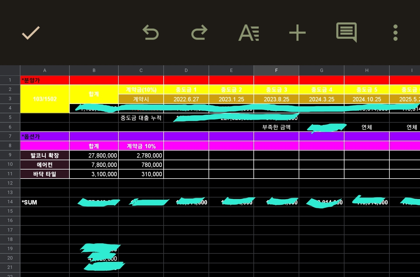 저희 부부는 중도금과 잔금에 대한 자금 계획을 구글독스에 정리해두었고, 갱신해가고 있습니다.