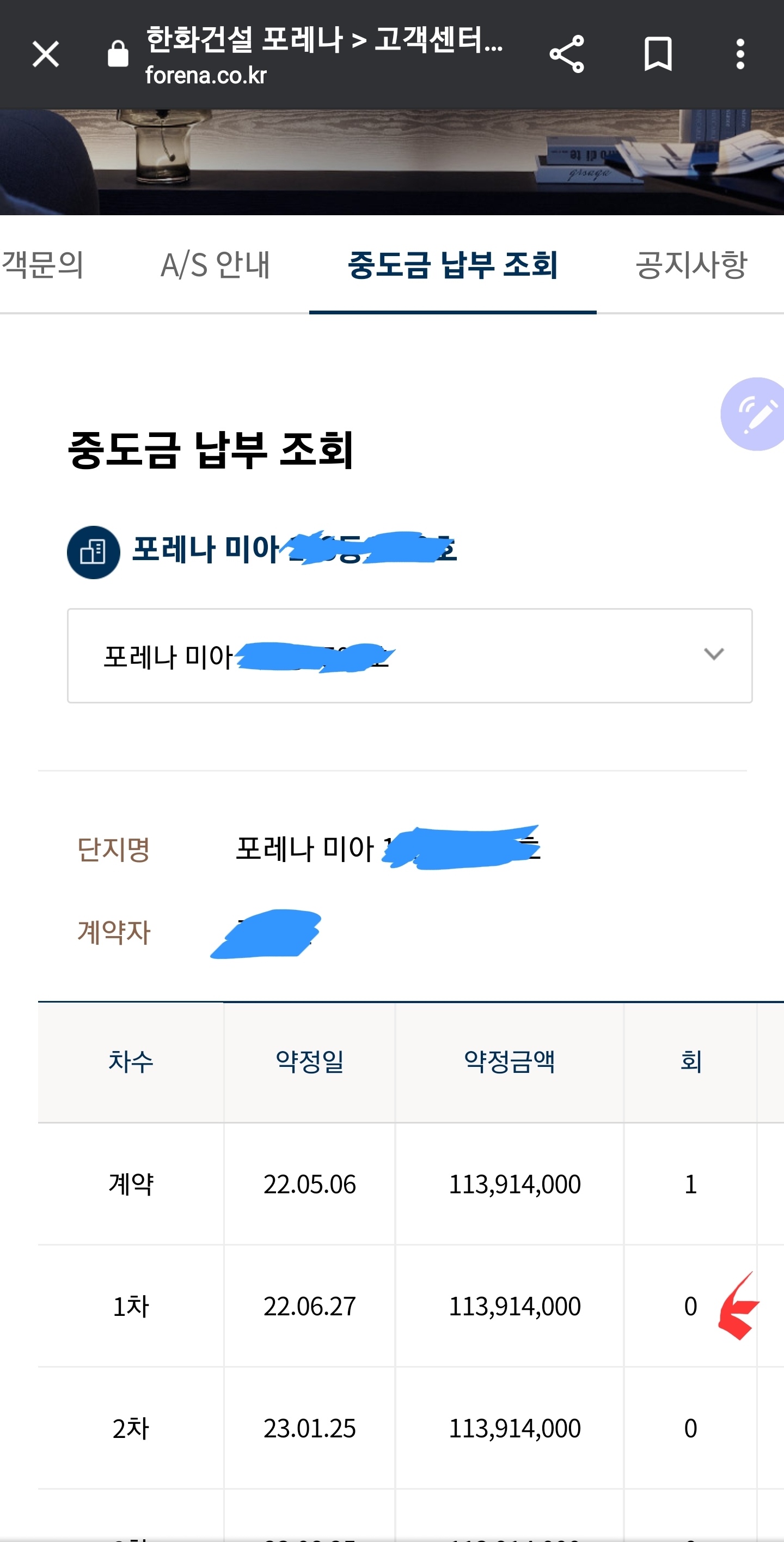 한화 포레나 홈페이지에서는 계약금 중도금, 잔금에 대해 납부 조회가 가능합니다.
