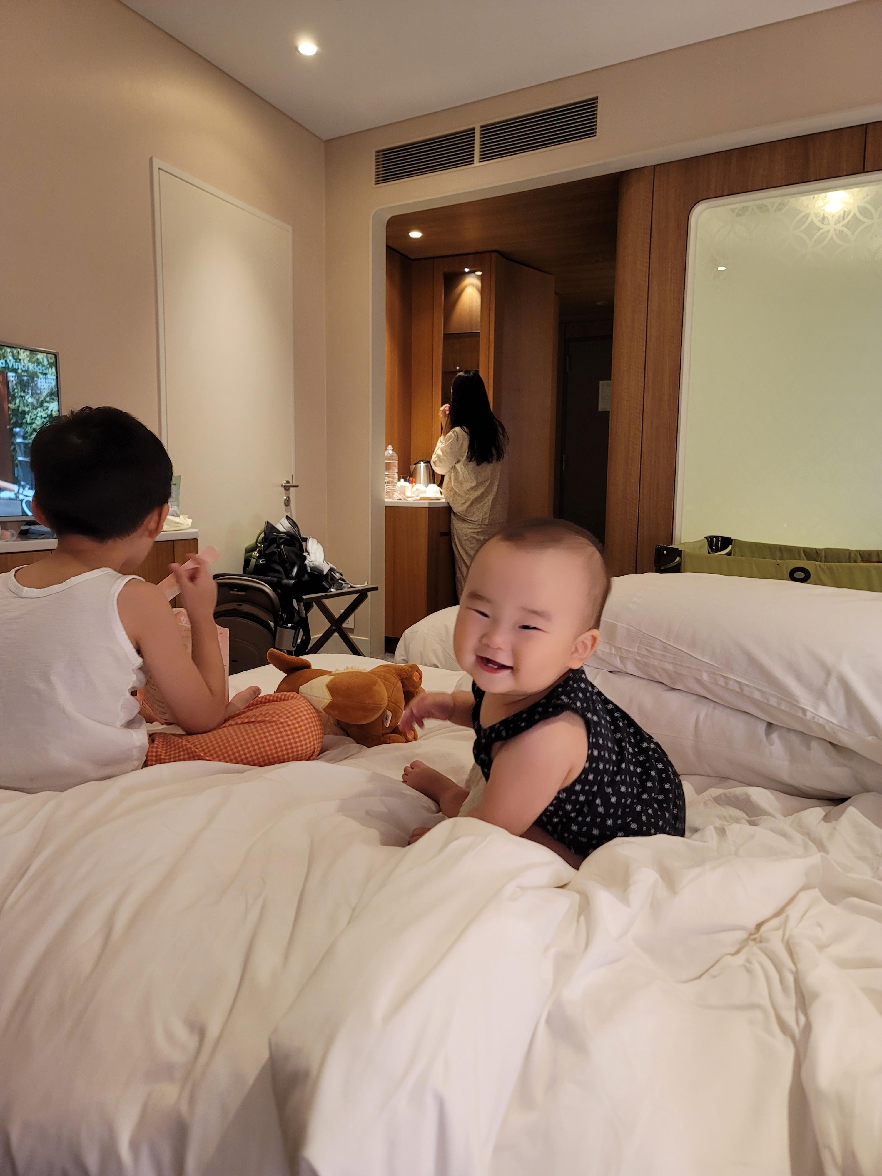아기침대를 요청할 수 있는데 조립/이동형 침대가 제공된다 고급스럽진 않고 바닥에 많이 붙어있어서 안정적이다.
