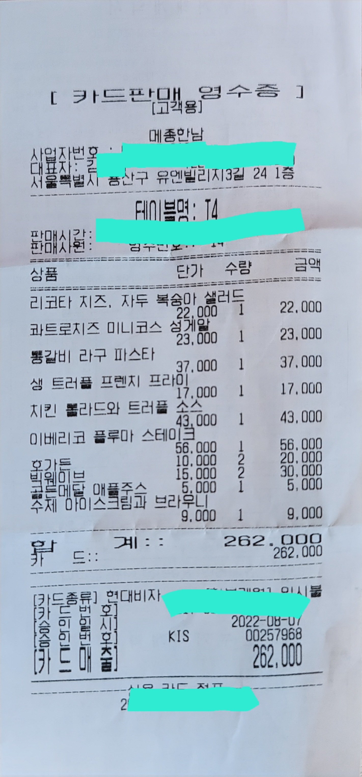 우리는 메뉴6개에 맥주와 음료를 주문했고 가격은 26만원정도니까 어른 셋 아이둘인데 이정도면 괜챃다고 생각한다.