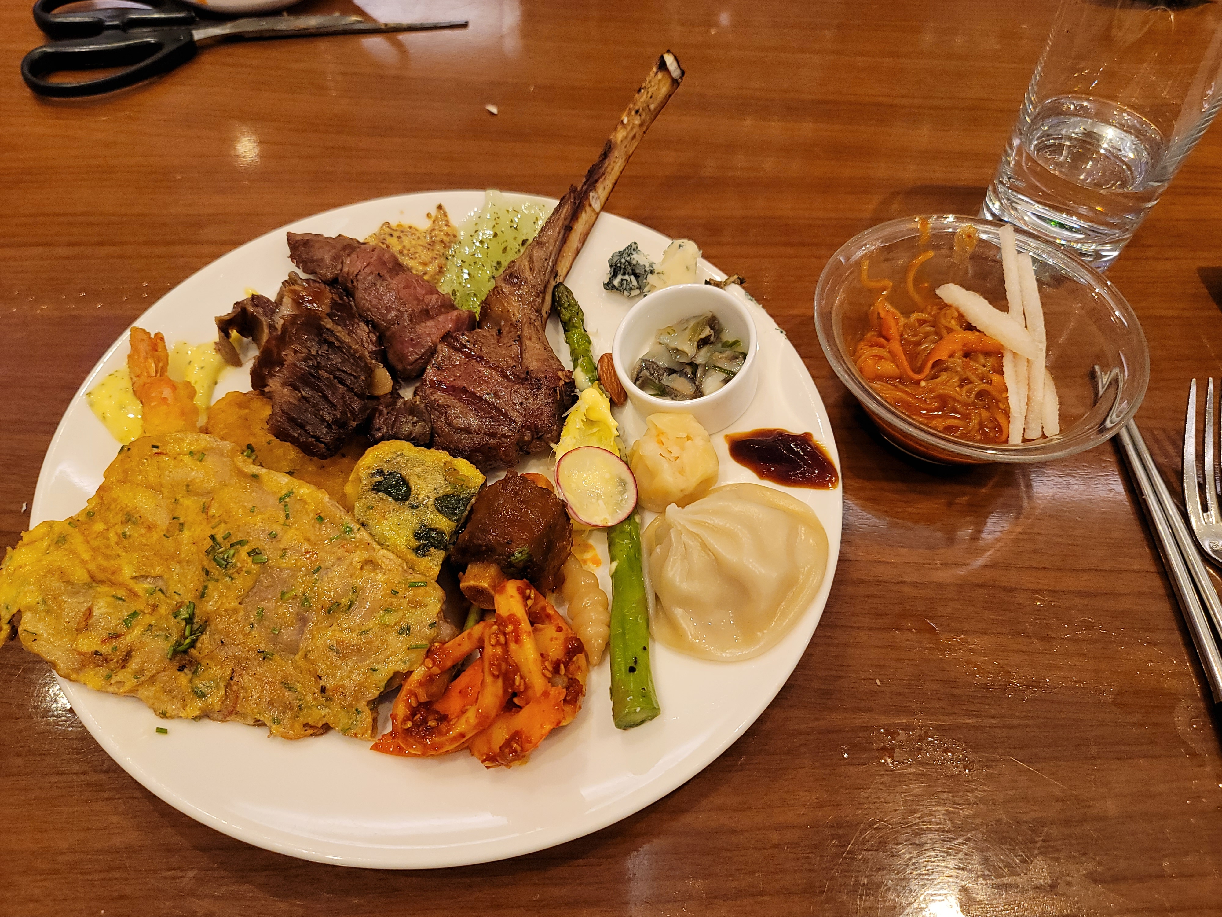 양갈비 좋았고, 우대갈비는 딱딱 퍽퍽했습니다. 수비드스테이크는 적당한 맛이었고, 육전은 좀 두껍지만 맛있엇습니다. 깻잎전과 오징어무침 문어 다 좋았습니다. 회비빔면(?)은 제가 가자미를 못먹는데 직원분이 주방에서 가자미 안들어간걸 확인해주셨습니다. 그것도 괜찮았고 새우튀김은 말할것도 없이 맛있었는데 의외로 고구마 튀김이 매우 만족스러웠습니다. 그리고 소롱포(샤오롱바오) 엄지척! 최고입니다.(개인적으론 팀호완보다 더...)