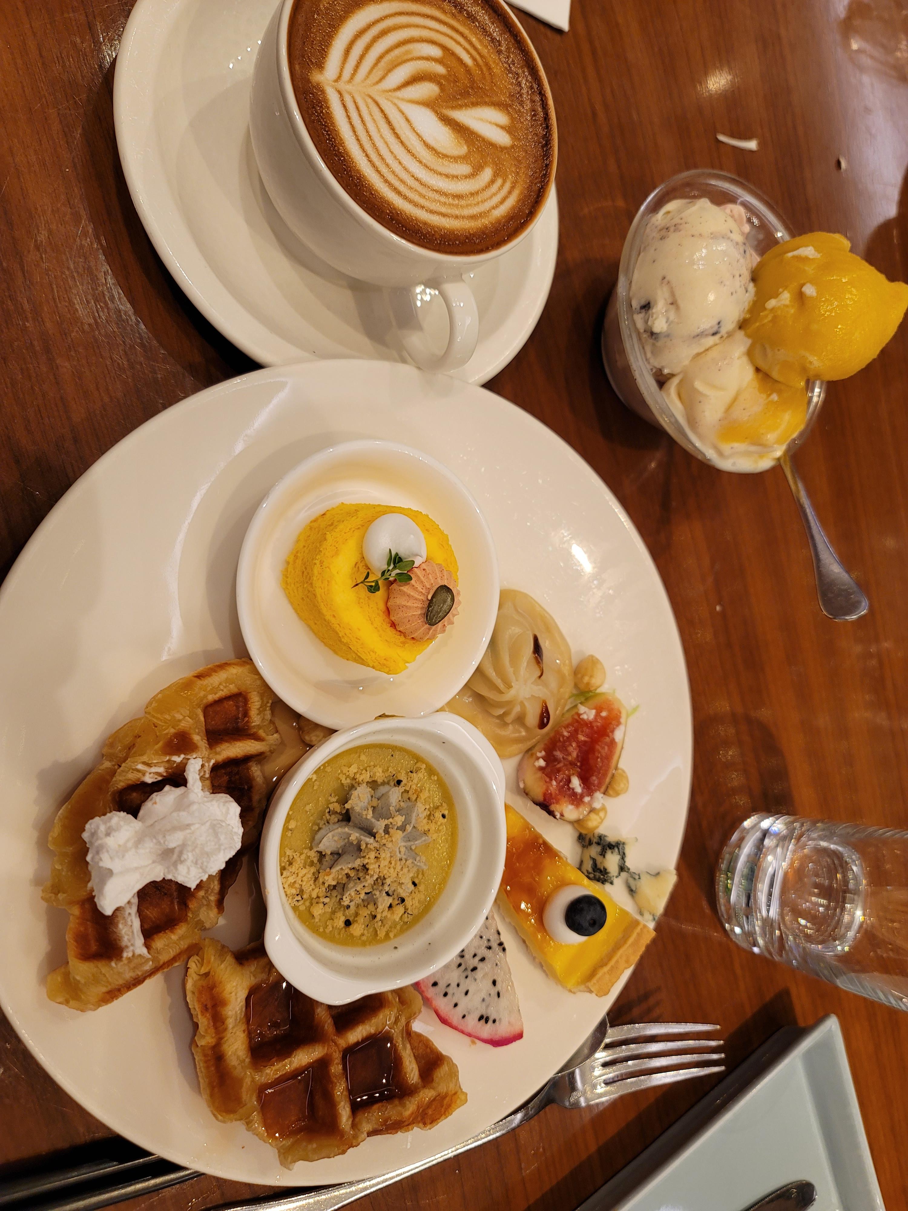 크림브륄레와 치즈케익이 촉촉?축축하게 맛있엇고 무화과샐러드도 달콤했는데 용과는 별로였습니다. 크로플은 아이스크림과 조합해서 맛있었고 커피도 마음에 들었습니다.
