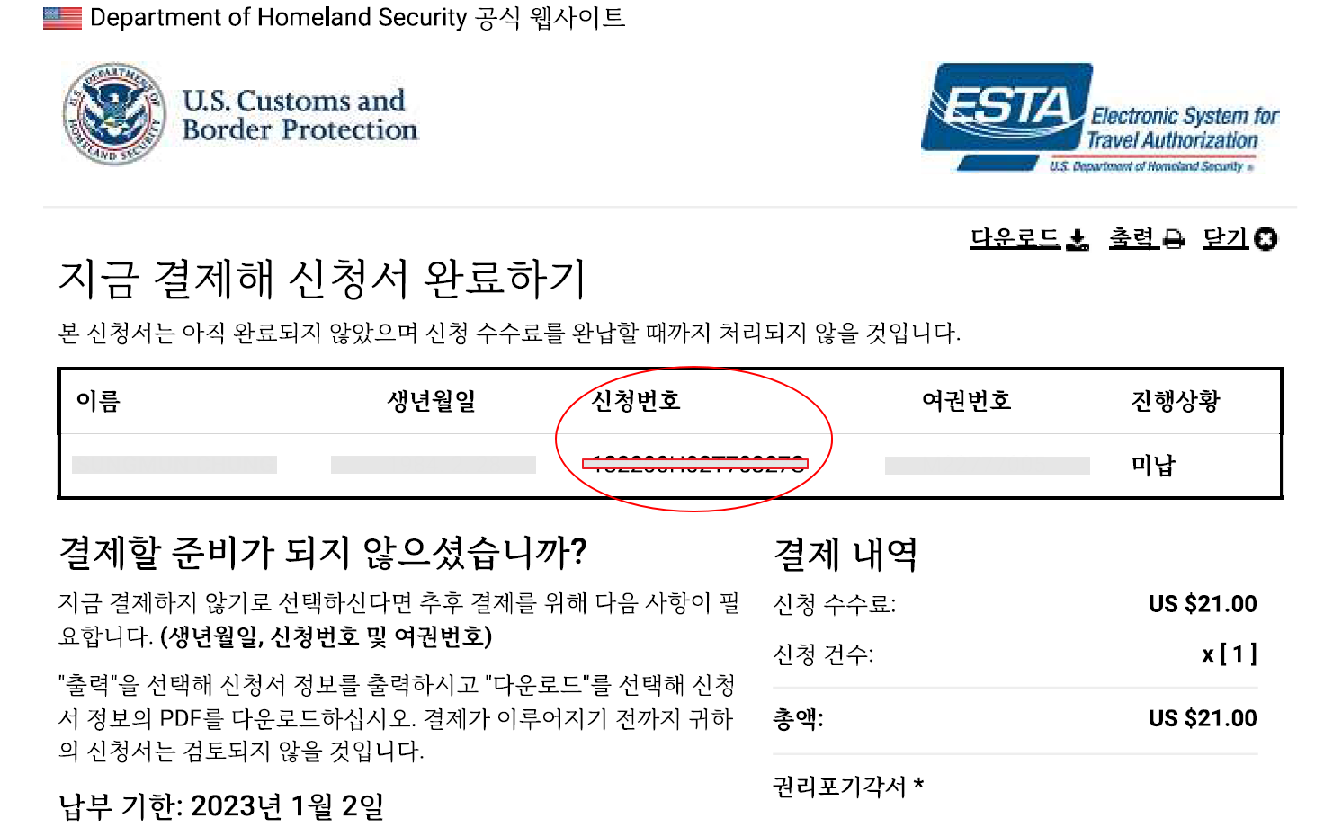 ESTA 신청 번호는 신청 당시에 출력도 가능하고,