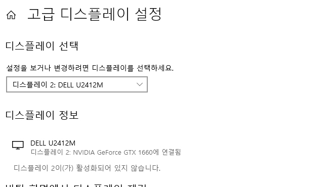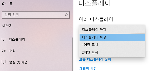 여러 디스플레이 설정에 하나의 모니터만 사용하도록 설정되어있는걸 확인했습니다. 설정을 변경해주고