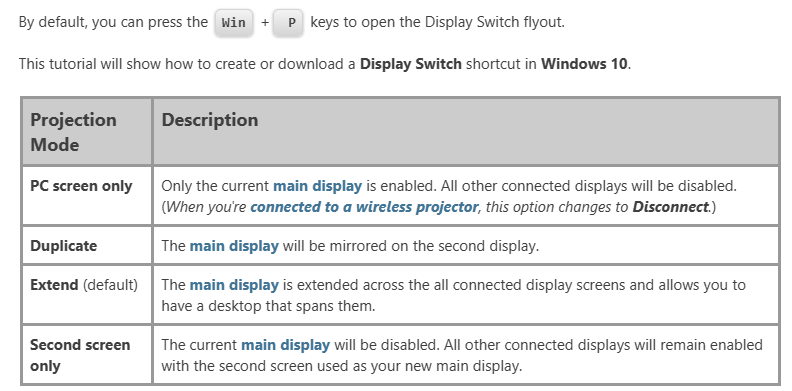 The shortcut to change the display mode was Windows + P, and it was confirmed that the display was changed immediately with that shortcut.