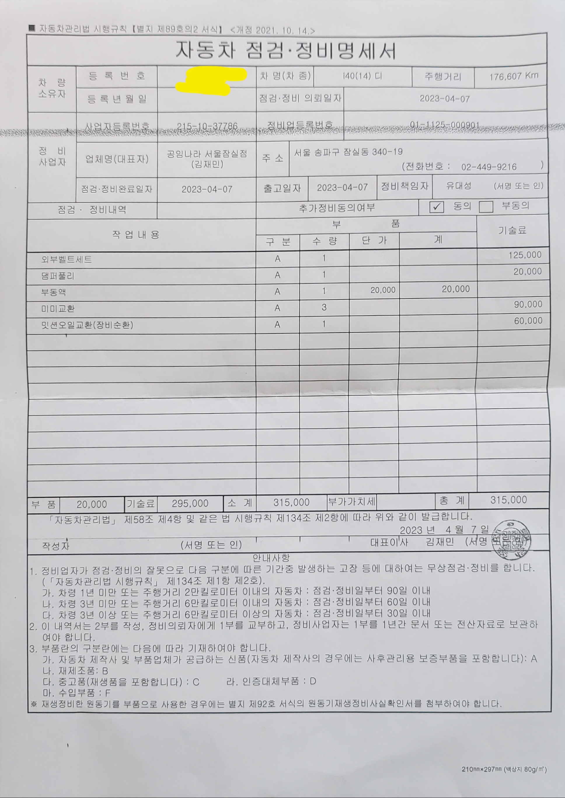 공임비 122500+20000(댐퍼풀리)+20000(부동액)+90000+60000 = 312500