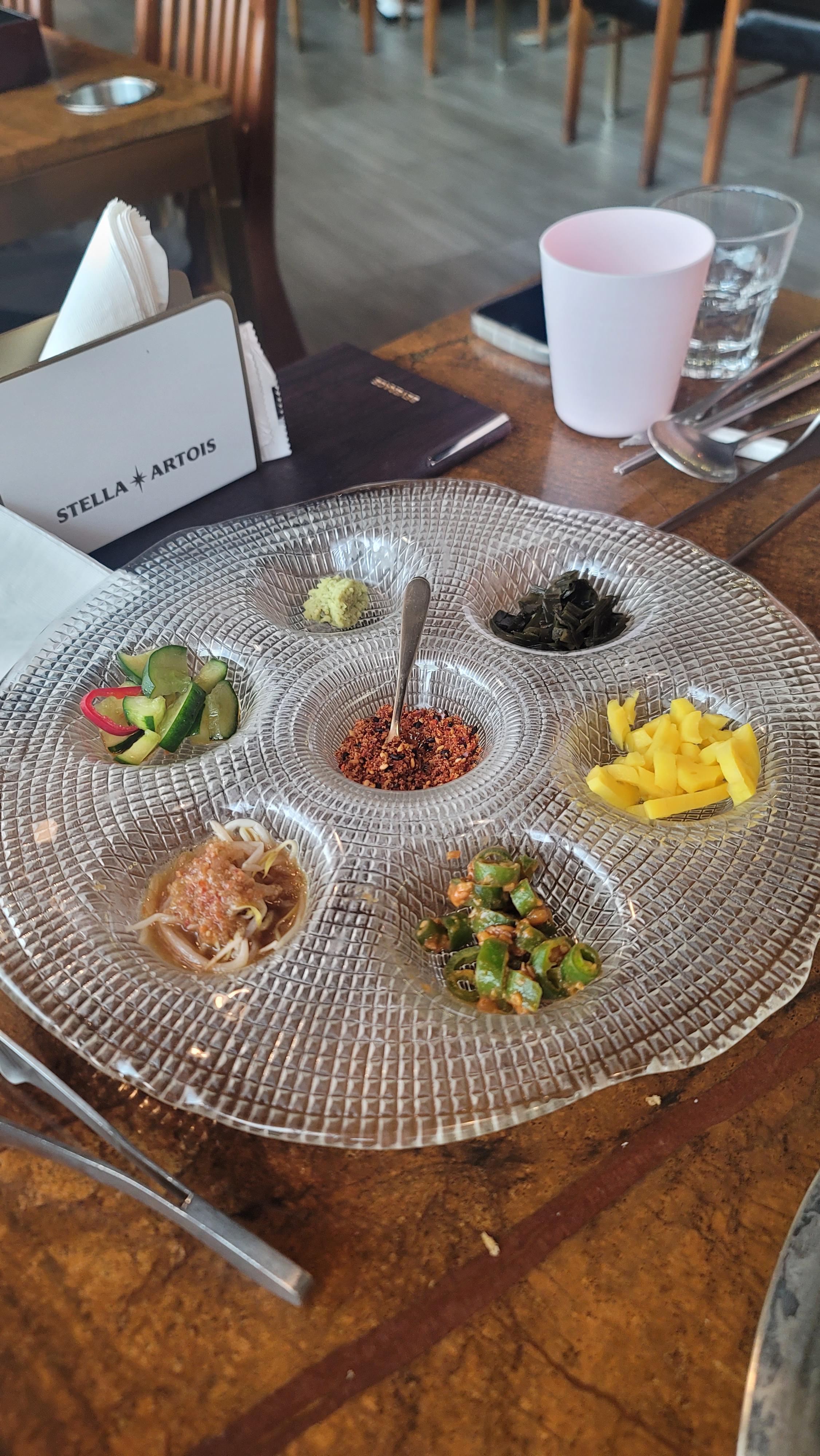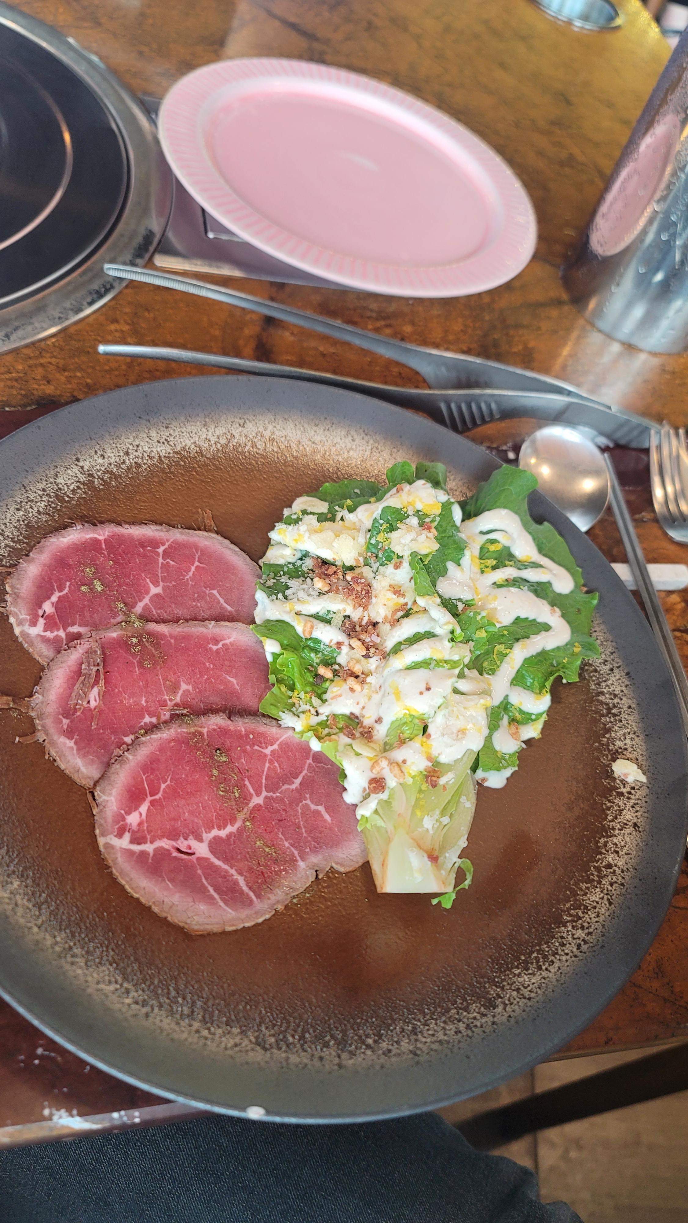 1. 한우 카르파초 : 상큼한 유자 샐러드와 얇은 한우 고기가 잘어울어지며 바삭한 쌀튀김같은 후레이크가 뿌려진 드레싱과 조화가 잘이루어진다 살짝 뿌려진 후추가 고기의 감칠맛을 더해주는듯 하다. 애들입맛엔 맞지않음