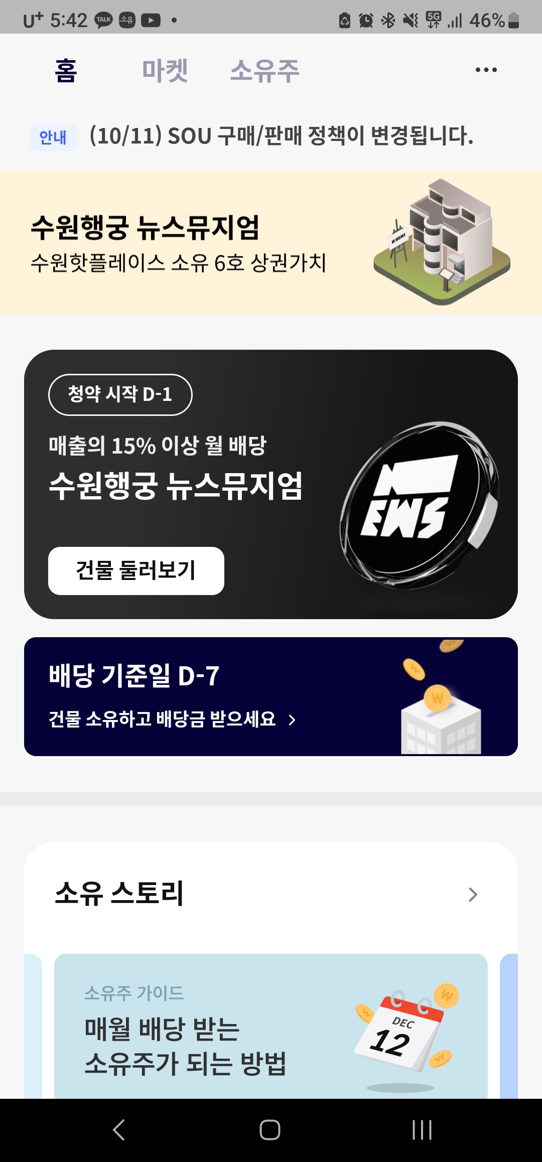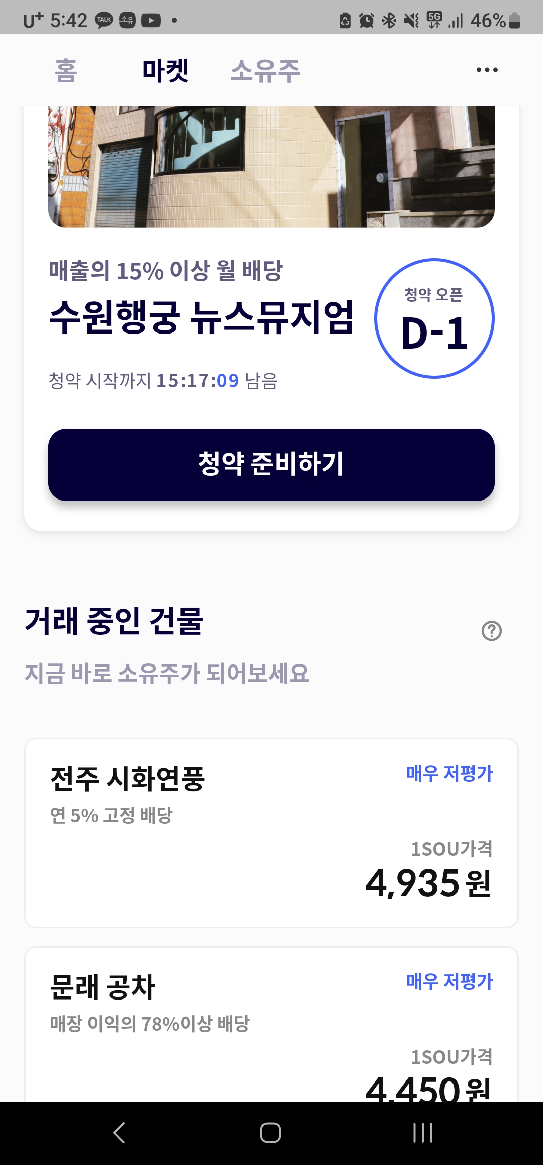 지금은 수원행궁(행리단길)에 숙박업소를 리모델링한 건물을 청약 받는 것 같다. 주식 과 같은 개념에 SOU라는 티켓을 사는데 수익이 안나면 되팔 수 있는가.. 구매자가 없으면 출구 전략이 없지 않나 하는 걱정은 있지만 한번 해볼까한다.