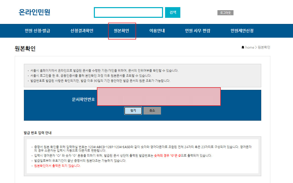 신청 완료 후에 원본확인 메뉴에 확인 번호를 입력하면