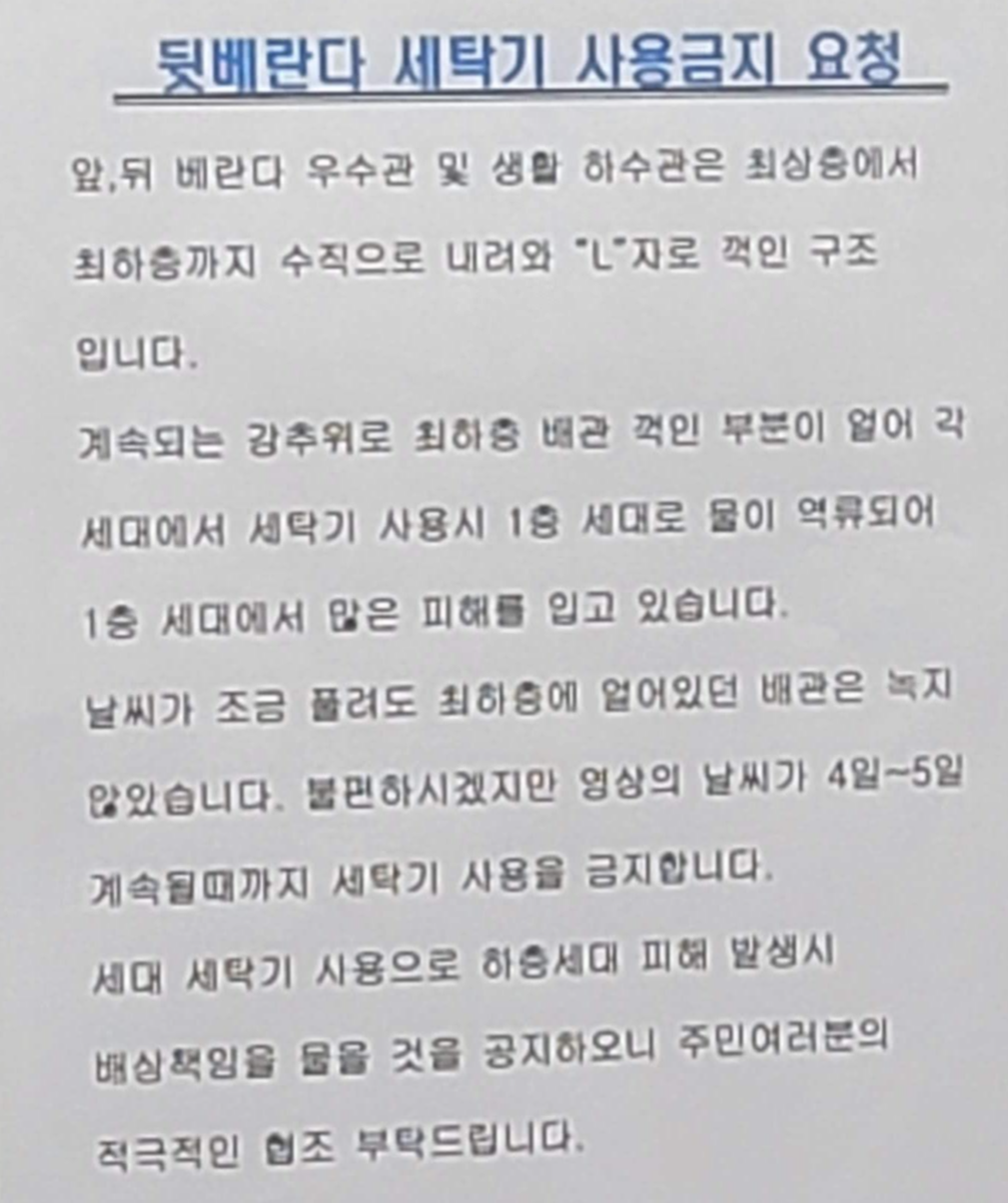 "앞쪽, 뒤쪽 베란다에 우수관이 얼어 저층 세대의 피해가 있으니 세탁기 사용을 금지"
