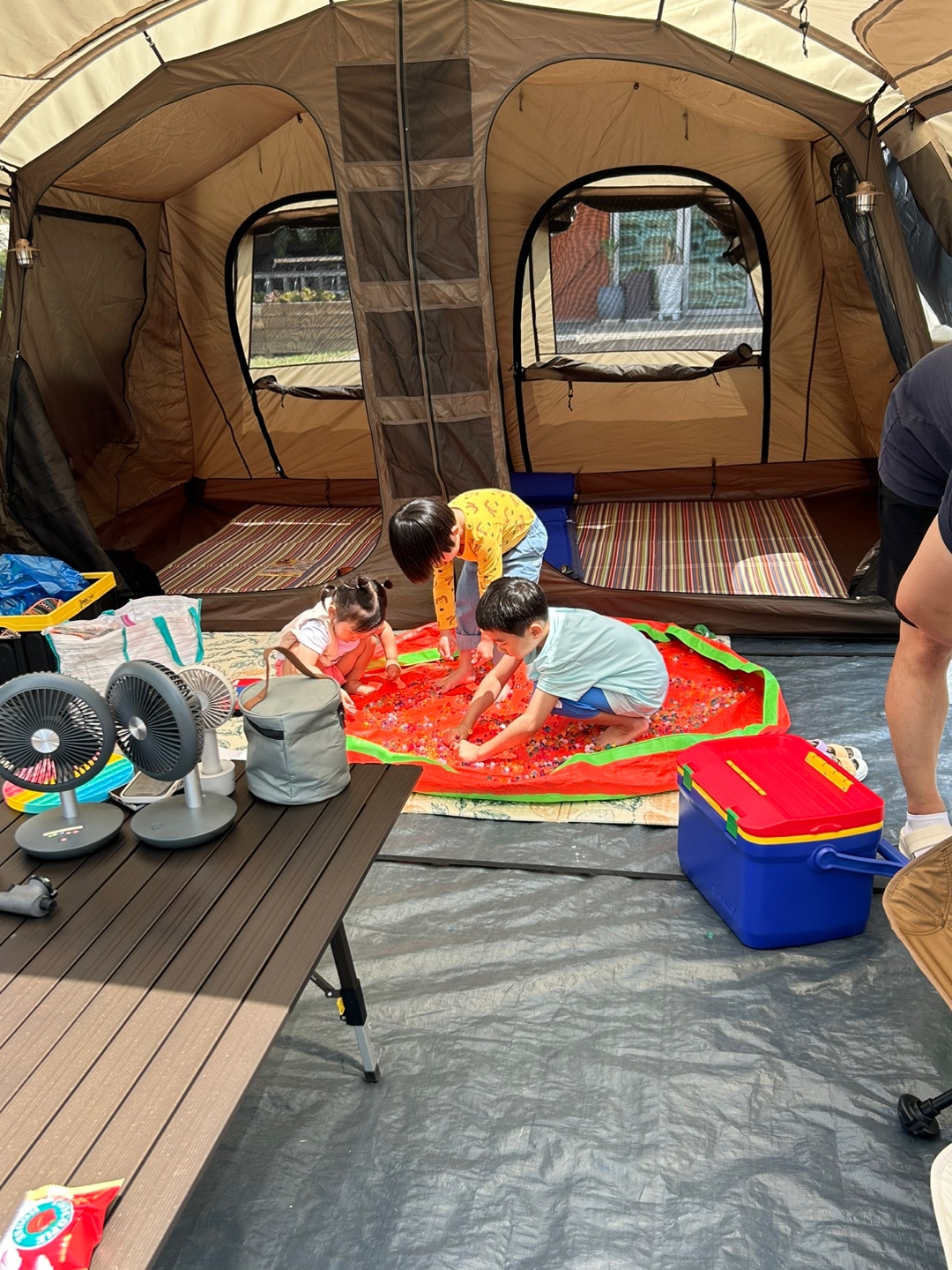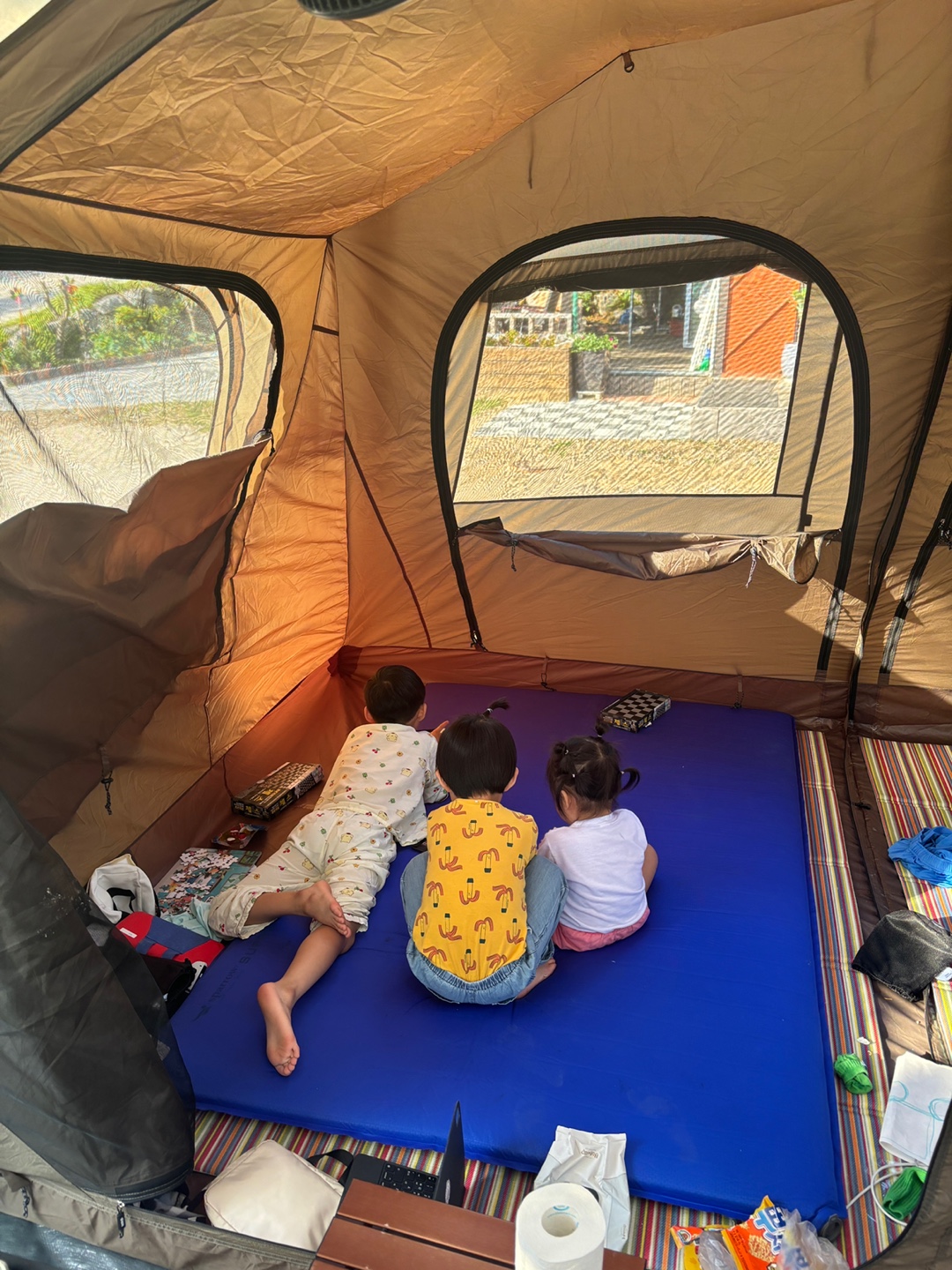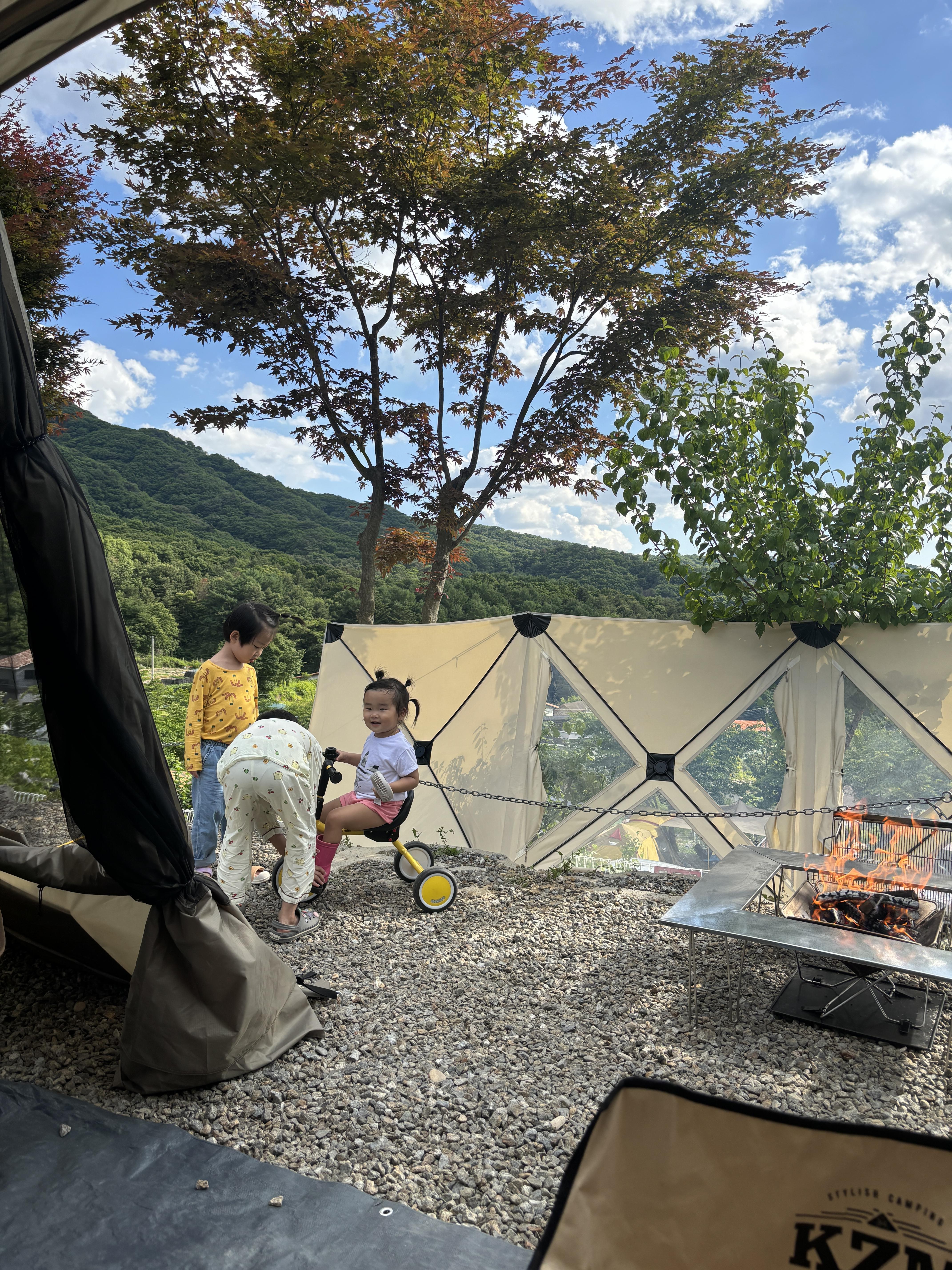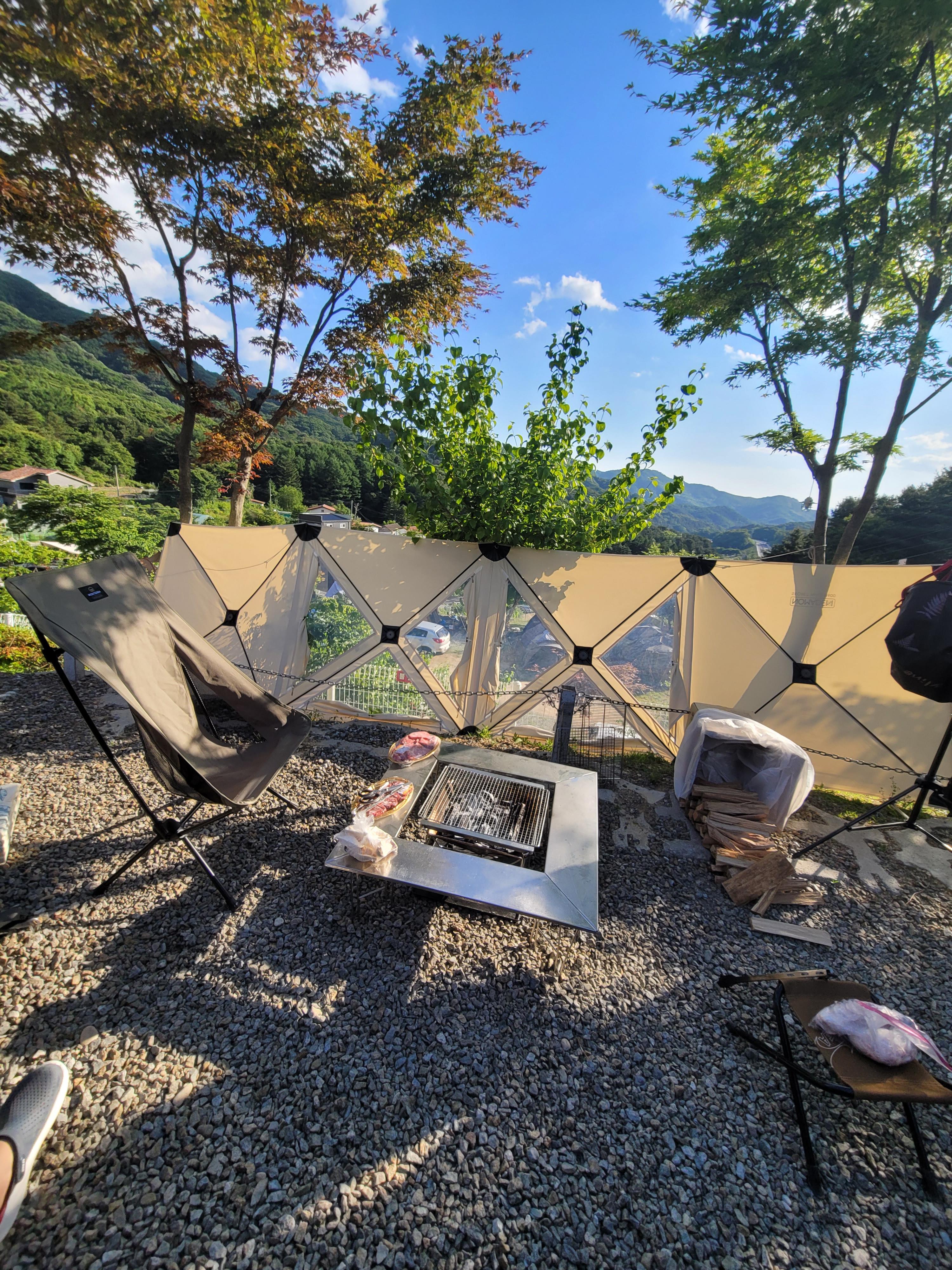 4인가족+3인가족 초청 캠핑이었는데 전실에서 부족함없이 놀고 먹고 앞에 불멍도 셋팅해두었습니다.