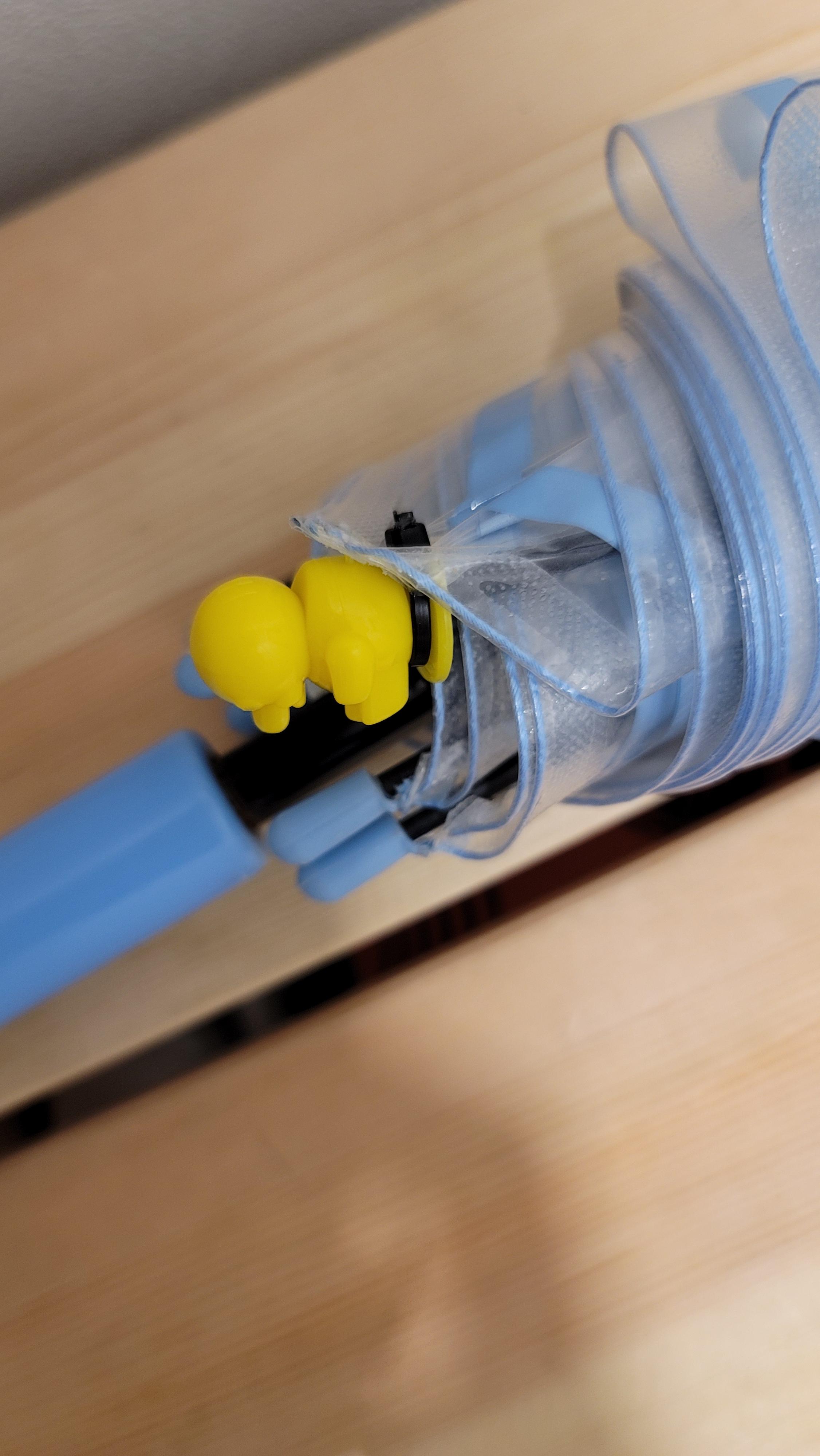 우산 꼭지에 오리가 달려 있어서