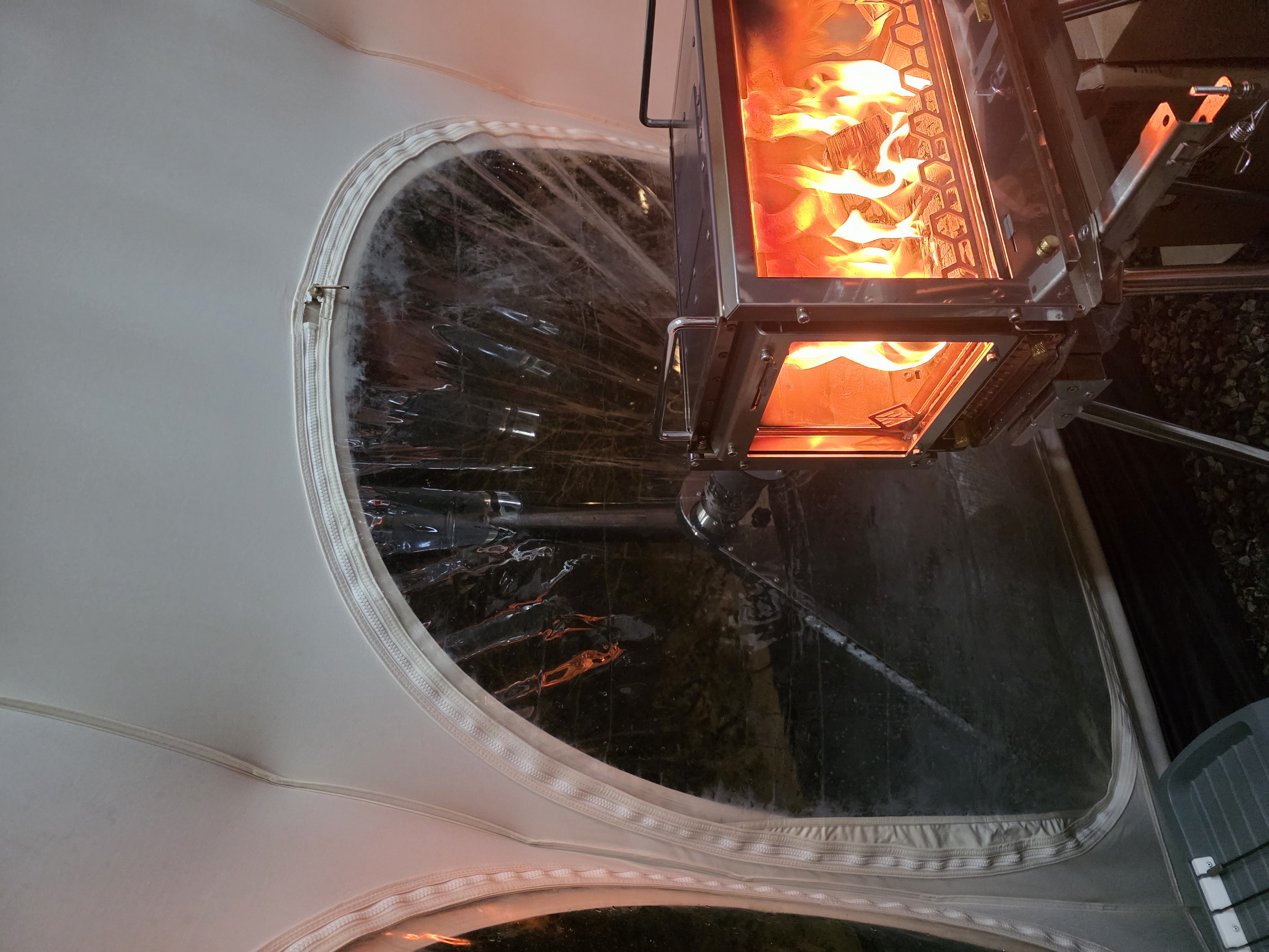 저녁에는 배가 불러 거를까 했지만, 준비한 소시지와 미니 돈가스, 그리고 '무파마' 라면의 유혹을 이기지 못했습니다. 화목난로에 밤을 구워 먹으며 맥주잔을 기울이다가 우리 가족은 장박 연장을 결정했습니다!