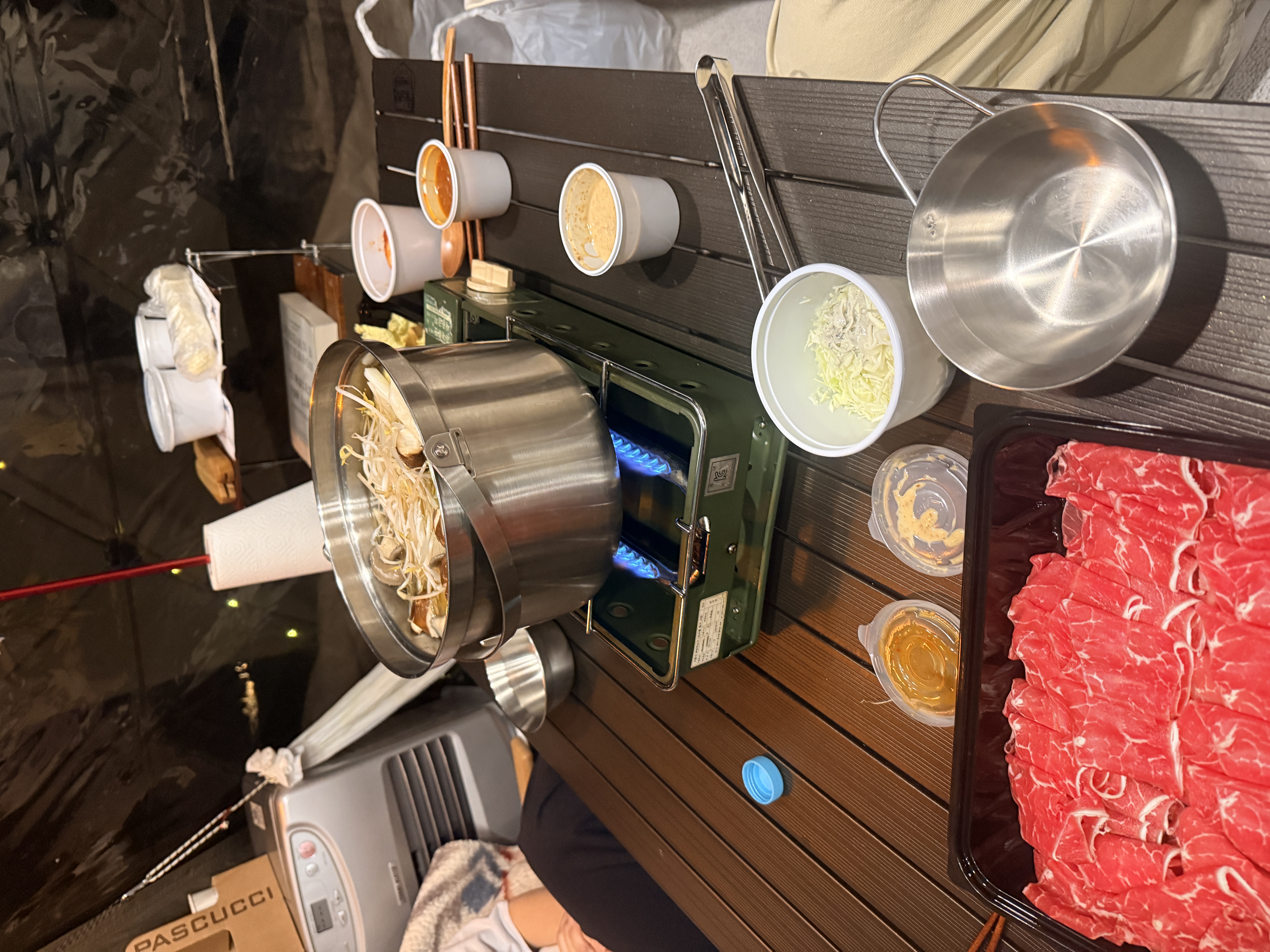After a busy day of working out and working hard, we headed to the campsite at 6 PM. For dinner, we picked up Shabu-shabu from our favorite spot, 'Shablanc.' I opened a beer not realizing it was slightly frozen, and experienced a mini-explosion! 😂