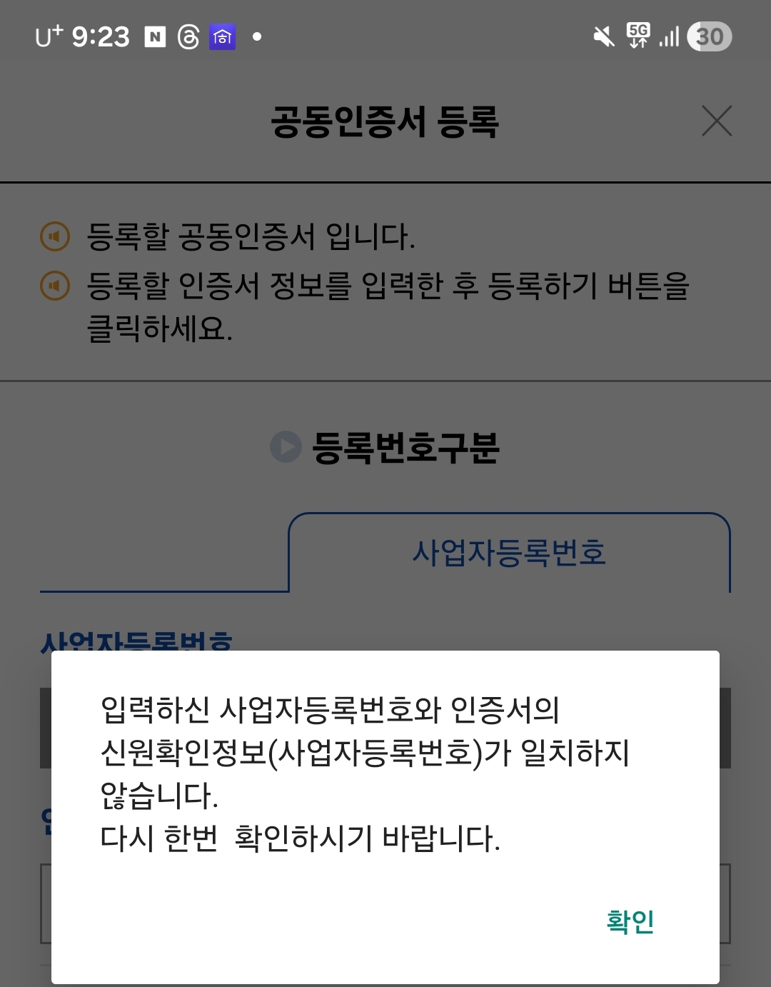개인사업자로서 각종 금융 업무나 세무 신고를 위해 공동인증서를 등록하다 보면, 분명히 내 사업자번호가 맞는데도 **"신원확인정보가 일치하지 않습니다"**라는 오류 메시지를 만날 때가 있습니다.