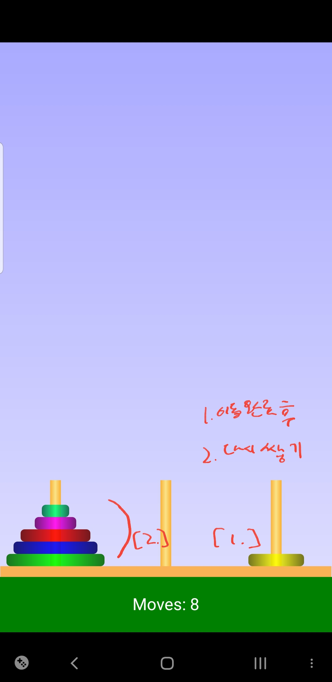 - 하나를 가장 오른쪽으로 보내고 남은 기둥에 보내진 원판 외에 나머지 원판을 차례대로 쌓고 진행한다