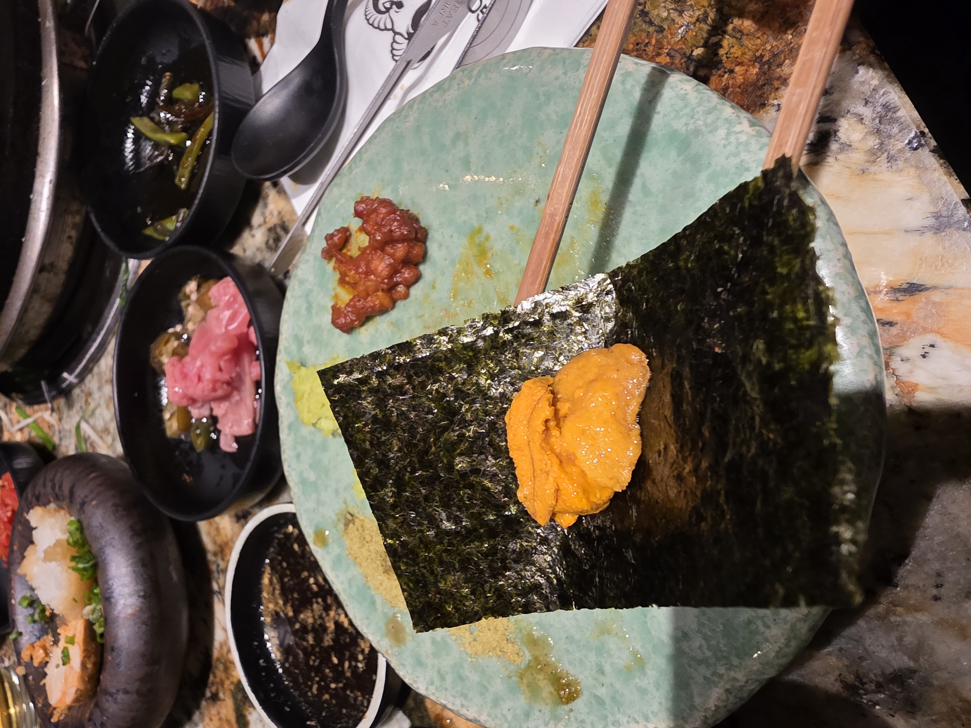 혹시 사진 속에서 제가 들고 있던 우니(성게알)와 김이나, 얼큰한 국물의 양고기 라면에 대해 더 궁금하신 점이 있으신가요?