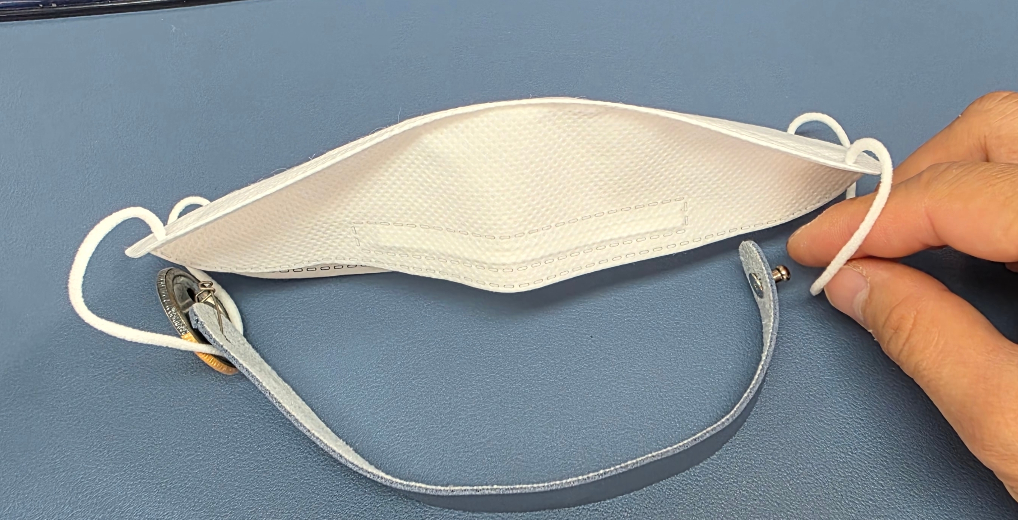 마스크를 착용하고, 이 끈을 머리 뒤쪽으로 넘겨 다른 쪽 마스크 귀 끈에 고정하면 끝!